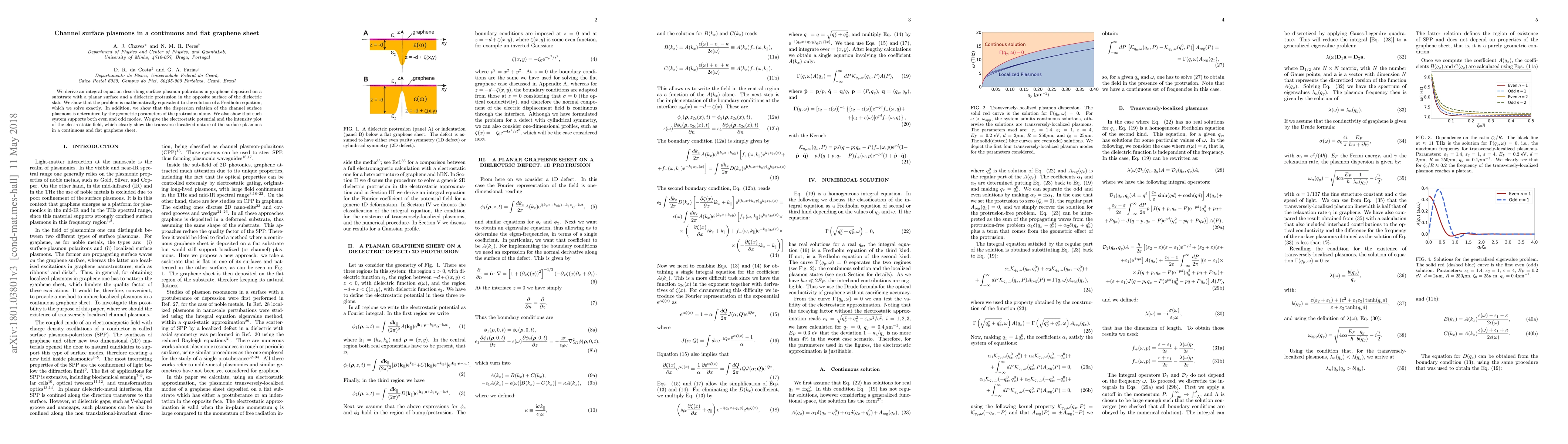 This paper derives an integral equation to describe surface-plasmon polaritons in graphene on a substrate with a dielectric protrusion, solving it exactly and showing it is equivalent to a Fredholm equation. It reveals that the dispersion relation depends on the protrusion's geometry and supports both even and odd modes, demonstrating localized surface plasmons in a flat graphene sheet.