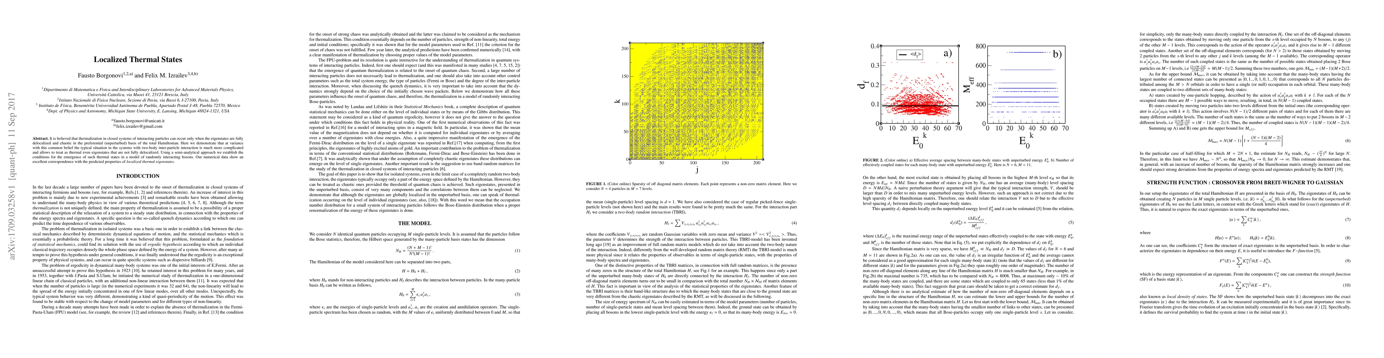 It is believed that thermalization in closed systems of interacting particles can occur only when the eigenstates are fully delocalized and chaotic in the preferential (unperturbed) basis of the total Hamiltonian. Here we demonstrate that at variance with this common belief the typical situation in the systems with two-body inter-particle interaction is much more complicated and allows to treat as thermal even eigenstates that are not fully delocalized. Using a semi-analytical approach we establish the conditions for the emergence of such thermal states in a model of randomly interacting bosons. Our numerical data show an excellent correspondence with the predicted properties of {\it localized thermal eigenstates}.