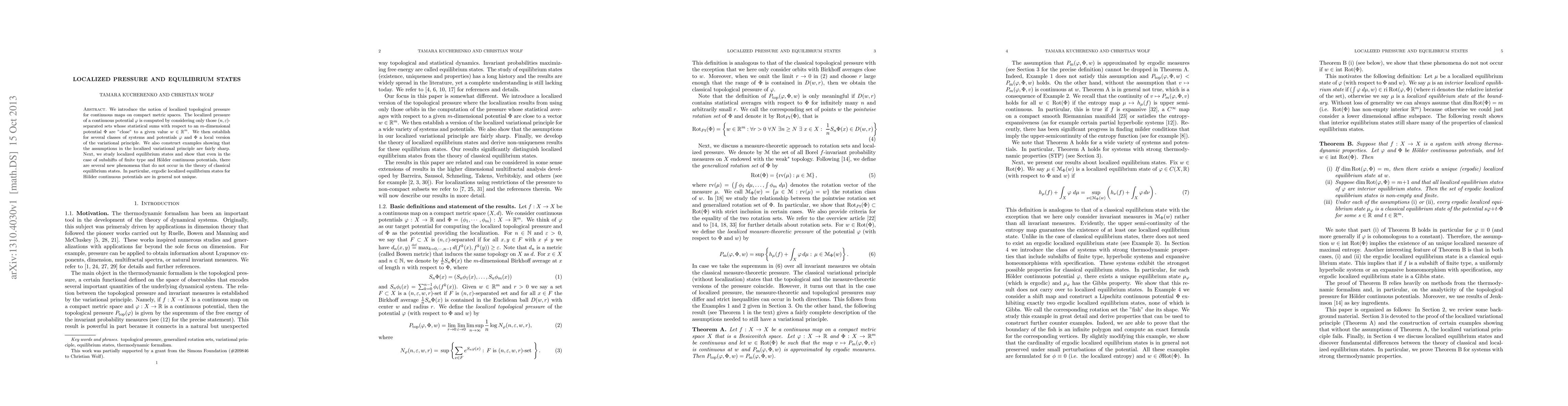 We introduce the notion of localized topological pressure for continuous maps on compact metric spaces. The localized pressure of a continuous potential $\varphi$ is computed by considering only those $(n,\epsilon)$-separated sets whose statistical sums with respect to an $m$-dimensional potential $\Phi$ are "close" to a given value $w\in \bR^m$. We then establish for several classes of systems and potentials $\varphi$ and $\Phi$ a local version of the variational principle. We also construct examples showing that the assumptions in the localized variational principle are fairly sharp. Next, we study localized equilibrium states and show that even in the case of subshifts of finite type and H\"older continuous potentials, there are several new phenomena that do not occur in the theory of classical equilibrium states. In particular, ergodic localized equilibrium states for H\"older continuous potentials are in general not unique.