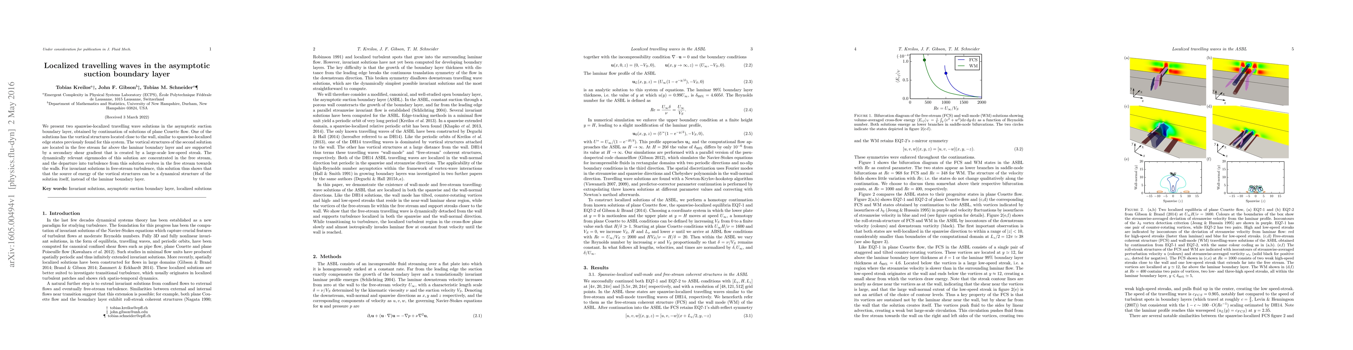 We present two spanwise-localized travelling wave solutions in the asymptotic suction boundary layer, obtained by continuation of solutions of plane Couette flow. One of the solutions has the vortical structures located close to the wall, similar to spanwise-localized edge states previously found for this system. The vortical structures of the second solution are located in the free stream far above the laminar boundary layer and are supported by a secondary shear gradient that is created by a large-scale low-speed streak. The dynamically relevant eigenmodes of this solution are concentrated in the free stream, and the departure into turbulence from this solution evolves in the free stream towards the walls. For invariant solutions in free-stream turbulence, this solution thus shows that that the source of energy of the vortical structures can be a dynamical structure of the solution itself, instead of the laminar boundary layer.