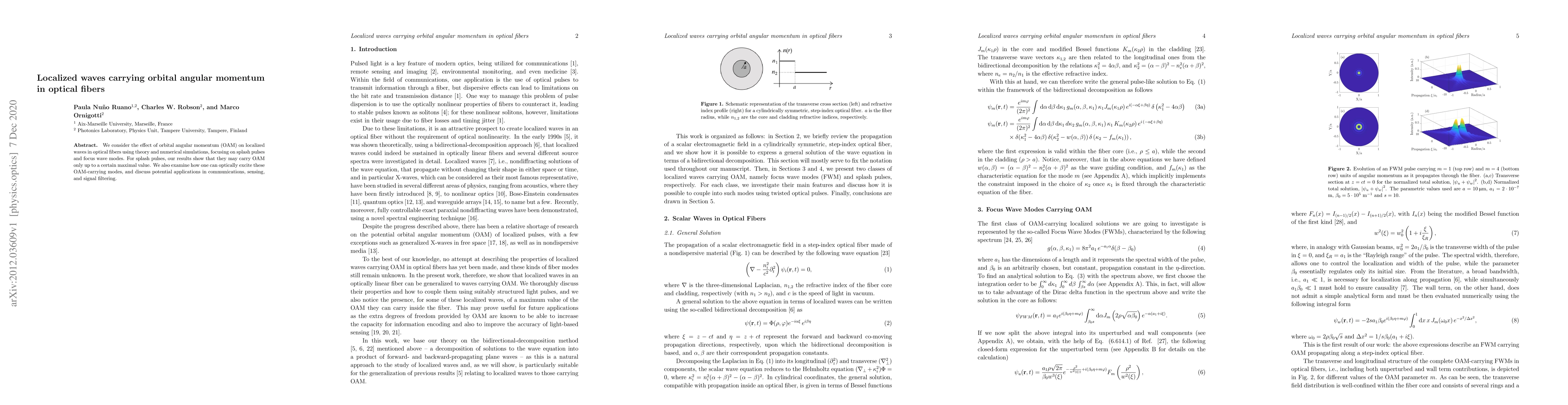 This paper explores how orbital angular momentum affects localized waves in optical fibers, particularly splash pulses and focus wave modes, and demonstrates that these waves can carry OAM up to a maximal value. It also investigates methods for optically exciting these modes and discusses their applications in communications, sensing, and signal filtering.
