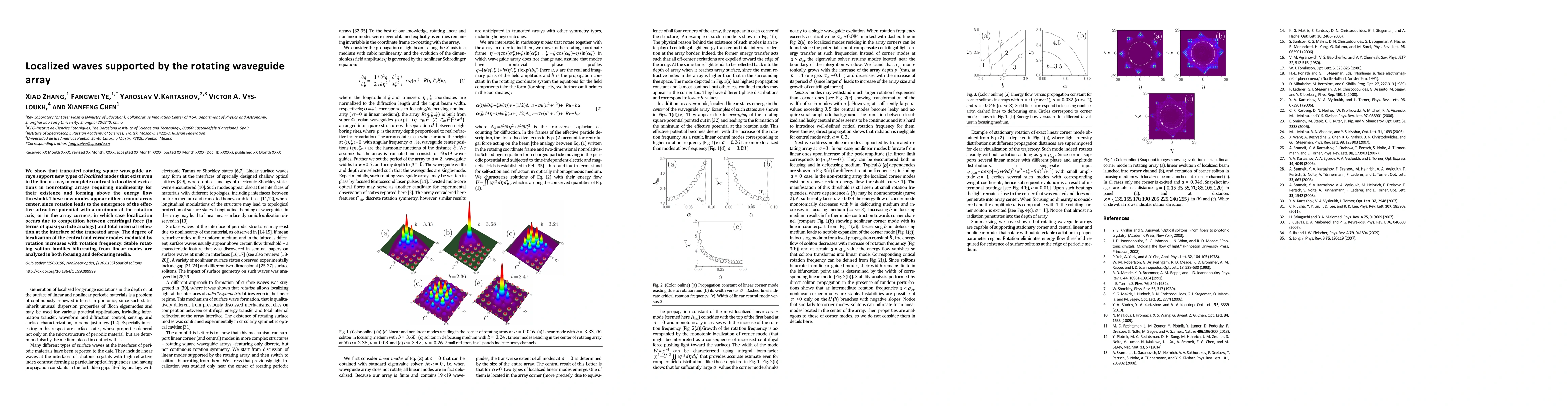 We show that truncated rotating square waveguide arrays support new types of localized modes that exist even in the linear case, in complete contrast to localized excitations in nonrotating arrays requiring nonlinearity for their existence and forming above the energy flow threshold. These new modes appear either around array center, since rotation leads to the emergence of the effective attractive potential with a minimum at the rotation axis, or in the array corners, in which case localization occurs due to competition between centrifugal force (in terms of quasi-particle analogy) and total internal reflection at the interface of the truncated array. The degree of localization of the central and corner modes mediated by rotation increases with rotation frequency. Stable rotating soliton families bifurcating from linear modes are analyzed in both focusing and defocusing media.