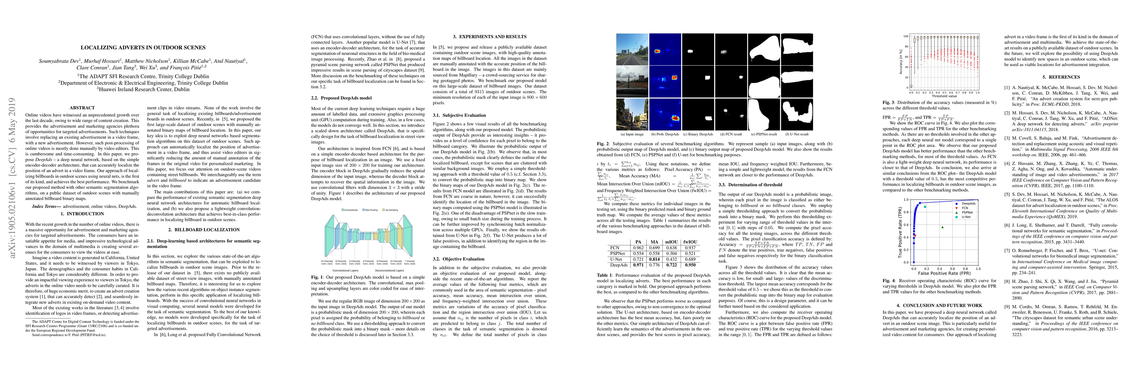 Online videos have witnessed an unprecedented growth over the last decade, owing to wide range of content creation. This provides the advertisement and marketing agencies plethora of opportunities for targeted advertisements. Such techniques involve replacing an existing advertisement in a video frame, with a new advertisement. However, such post-processing of online videos is mostly done manually by video editors. This is cumbersome and time-consuming. In this paper, we propose DeepAds -- a deep neural network, based on the simple encoder-decoder architecture, that can accurately localize the position of an advert in a video frame. Our approach of localizing billboards in outdoor scenes using neural nets, is the first of its kind, and achieves the best performance. We benchmark our proposed method with other semantic segmentation algorithms, on a public dataset of outdoor scenes with manually annotated billboard binary maps.