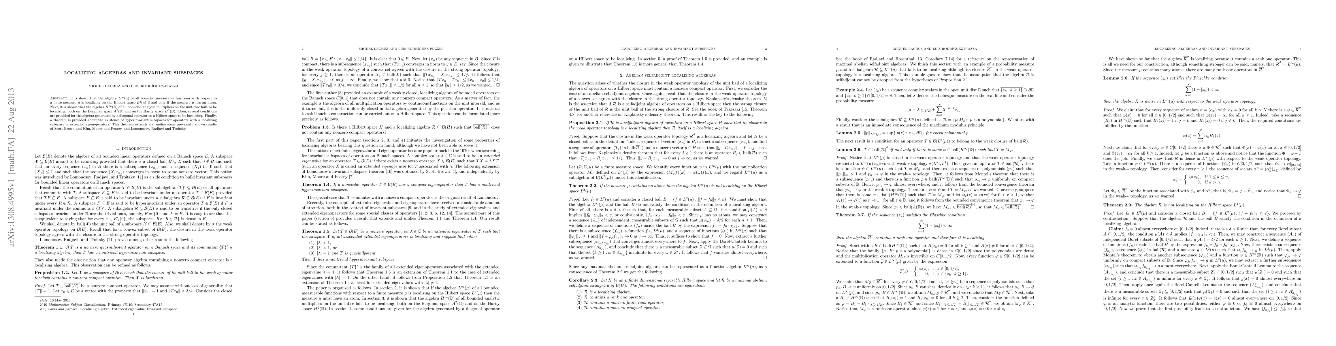 It is shown that the algebra \(L^\infty(\mu)\) of all bounded measurable functions with respect to a finite measure \(\mu\) is localizing on the Hilbert space \(L^2(\mu)\) if and only if the measure \(\mu\) has an atom. Next, it is shown that the algebra \(H^\infty({\mathbb D})\) of all bounded analytic multipliers on the unit disc fails to be localizing, both on the Bergman space \(A^2({\mathbb D})\) and on the Hardy space \(H^2({\mathbb D}).\) Then, several conditions are provided for the algebra generated by a diagonal operator on a Hilbert space to be localizing. Finally, a theorem is provided about the existence of hyperinvariant subspaces for operators with a localizing subspace of extended eigenoperators. This theorem extends and unifies some previously known results of Scott Brown and Kim, Moore and Pearcy, and Lomonosov, Radjavi and Troitsky.