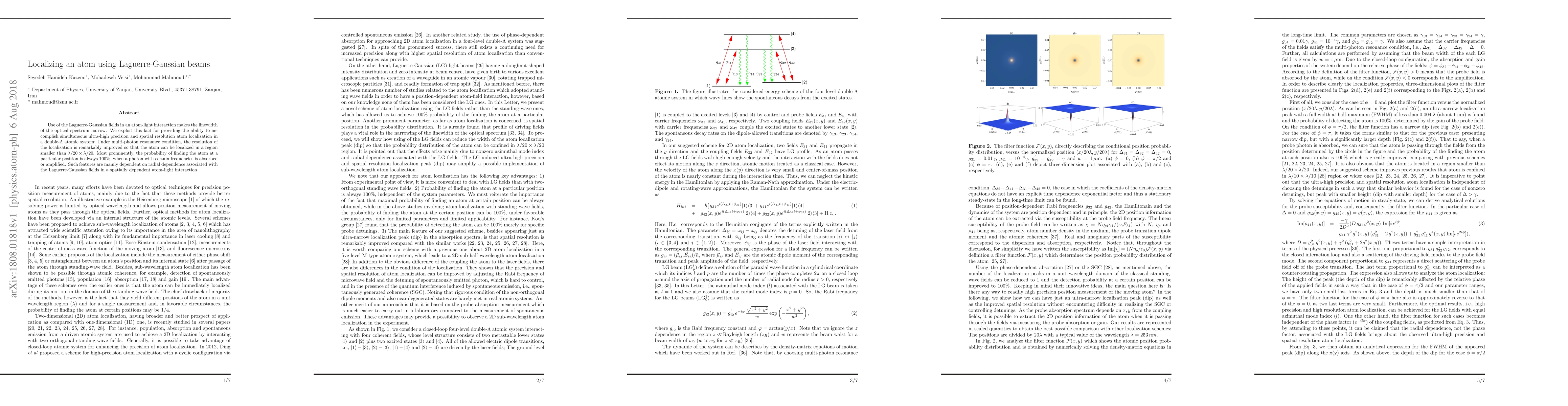 Use of the Laguerre-Gaussian fields in an atom-light interaction makes the linewidth of the optical spectrum narrow. We exploit this fact for providing the ability to accomplish simultaneous ultra-high precision and spatial resolution atom localization in a double-$\Lambda$ atomic system. Under multi-photon resonance condition, the resolution of the localization is remarkably improved so that the atom can be localized in a region smaller than $\lambda/20 \times \lambda/20$. Most prominently, the probability of finding the atom at a particular position is always 100%, when a photon with certain frequencies is absorbed or amplified. Such features are mainly dependent on radial dependence associated with the Laguerre-Gaussian fields in a spatially dependent atom-light interaction.