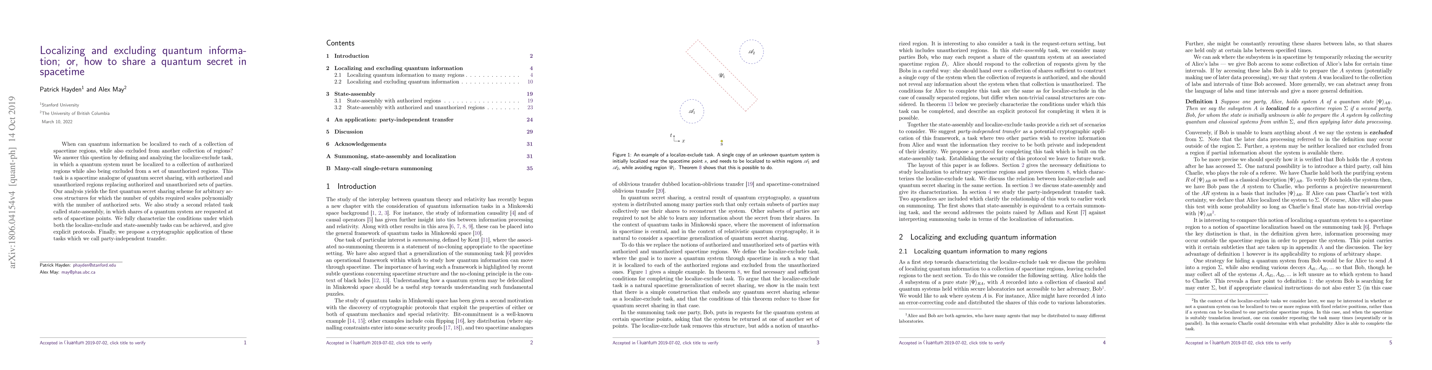 When can quantum information be localized to each of a collection of spacetime regions, while also excluded from another collection of regions? We answer this question by defining and analyzing the localize-exclude task, in which a quantum system must be localized to a collection of authorized regions while also being excluded from a set of unauthorized regions. This task is a spacetime analogue of quantum secret sharing, with authorized and unauthorized regions replacing authorized and unauthorized sets of parties. Our analysis yields the first quantum secret sharing scheme for arbitrary access structures for which the number of qubits required scales polynomially with the number of authorized sets. We also study a second related task called state-assembly, in which shares of a quantum system are requested at sets of spacetime points. We fully characterize the conditions under which both the localize-exclude and state-assembly tasks can be achieved, and give explicit protocols. Finally, we propose a cryptographic application of these tasks which we call party-independent transfer.