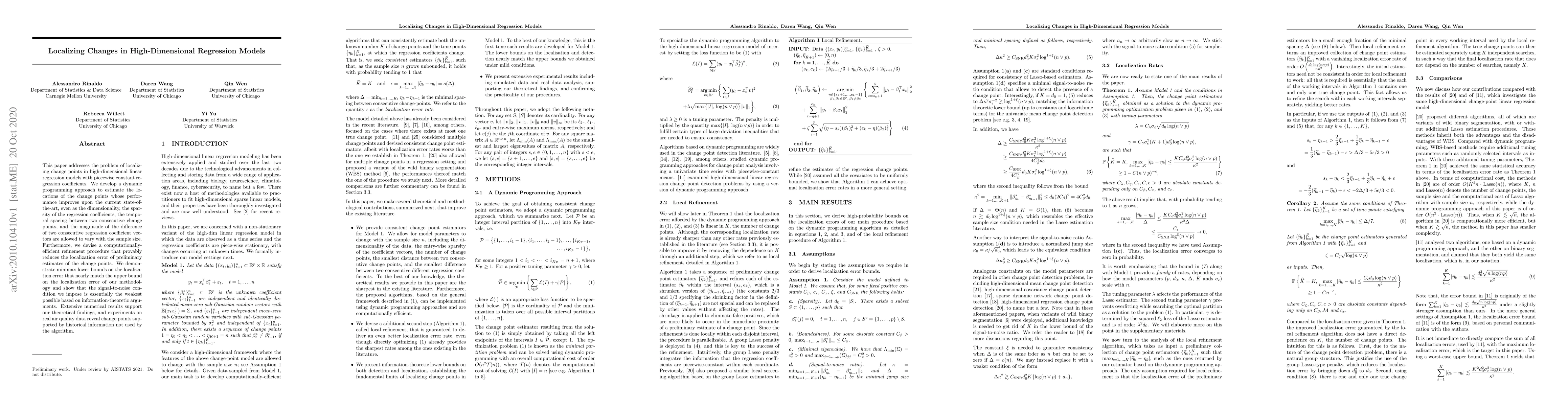 This paper addresses the problem of localizing change points in high-dimensional linear regression models with piecewise constant regression coefficients. We develop a dynamic programming approach to estimate the locations of the change points whose performance improves upon the current state-of-the-art, even as the dimensionality, the sparsity of the regression coefficients, the temporal spacing between two consecutive change points, and the magnitude of the difference of two consecutive regression coefficient vectors are allowed to vary with the sample size. Furthermore, we devise a computationally-efficient refinement procedure that provably reduces the localization error of preliminary estimates of the change points. We demonstrate minimax lower bounds on the localization error that nearly match the upper bound on the localization error of our methodology and show that the signal-to-noise condition we impose is essentially the weakest possible based on information-theoretic arguments. Extensive numerical results support our theoretical findings, and experiments on real air quality data reveal change points supported by historical information not used by the algorithm.