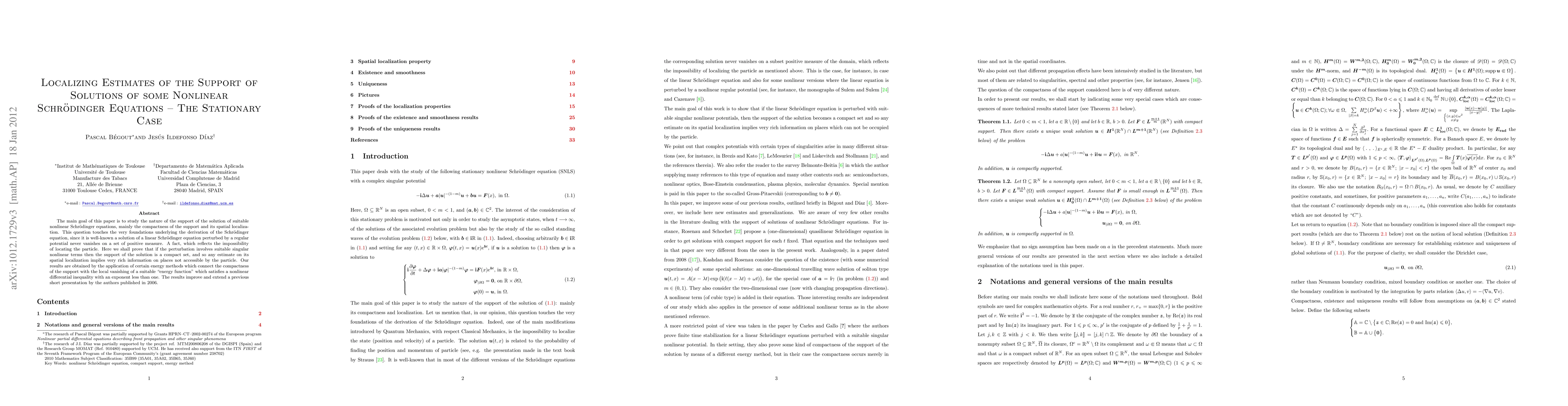 This paper explores the compactness and spatial localization of solutions' support in nonlinear Schrödinger equations, contrasting with linear Schrödinger equations where solutions never vanish on positive measured subsets, implying delocalization. The study utilizes energy methods to link compact support with local vanishing of a specific energy function, offering improved insights over previous work.