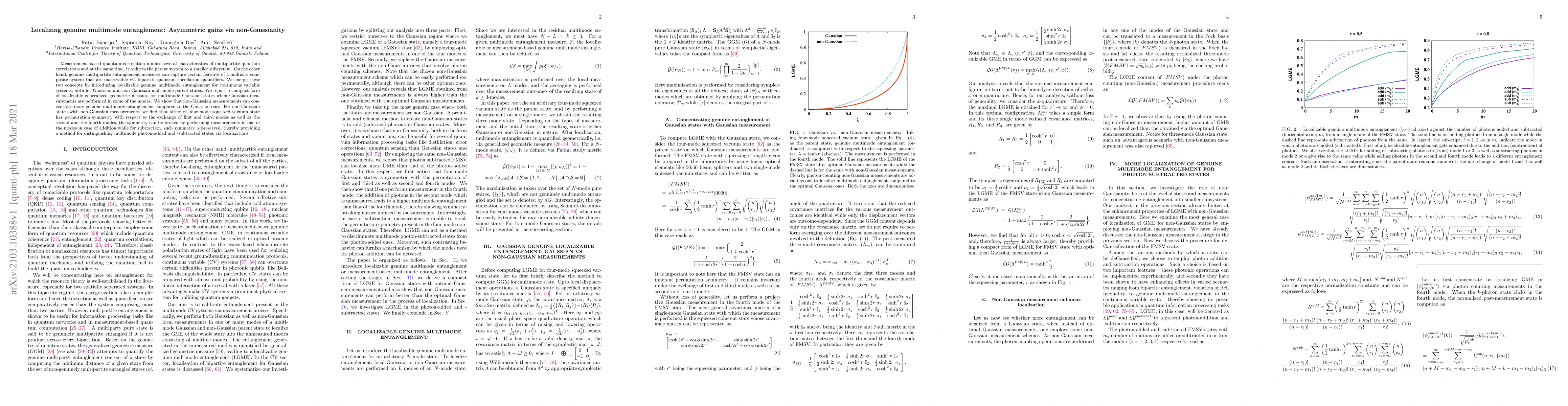 This paper introduces a method for localizing genuine multimode entanglement in continuous variable systems, demonstrating that non-Gaussian measurements can yield asymmetric gains in entanglement concentration compared to Gaussian measurements. It also reveals that non-Gaussian states can exhibit symmetry breaking under certain measurement conditions, offering a way to distinguish between photon-added and subtracted states.