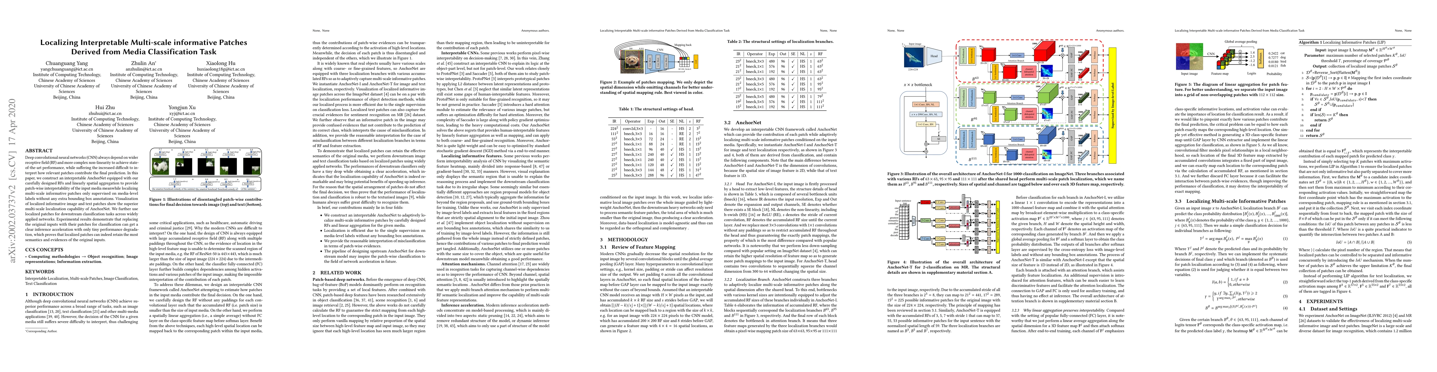 Deep convolutional neural networks (CNN) always depend on wider receptive field (RF) and more complex non-linearity to achieve state-of-the-art performance, while suffering the increased difficult to interpret how relevant patches contribute the final prediction. In this paper, we construct an interpretable AnchorNet equipped with our carefully designed RFs and linearly spatial aggregation to provide patch-wise interpretability of the input media meanwhile localizing multi-scale informative patches only supervised on media-level labels without any extra bounding box annotations. Visualization of localized informative image and text patches show the superior multi-scale localization capability of AnchorNet. We further use localized patches for downstream classification tasks across widely applied networks. Experimental results demonstrate that replacing the original inputs with their patches for classification can get a clear inference acceleration with only tiny performance degradation, which proves that localized patches can indeed retain the most semantics and evidences of the original inputs.