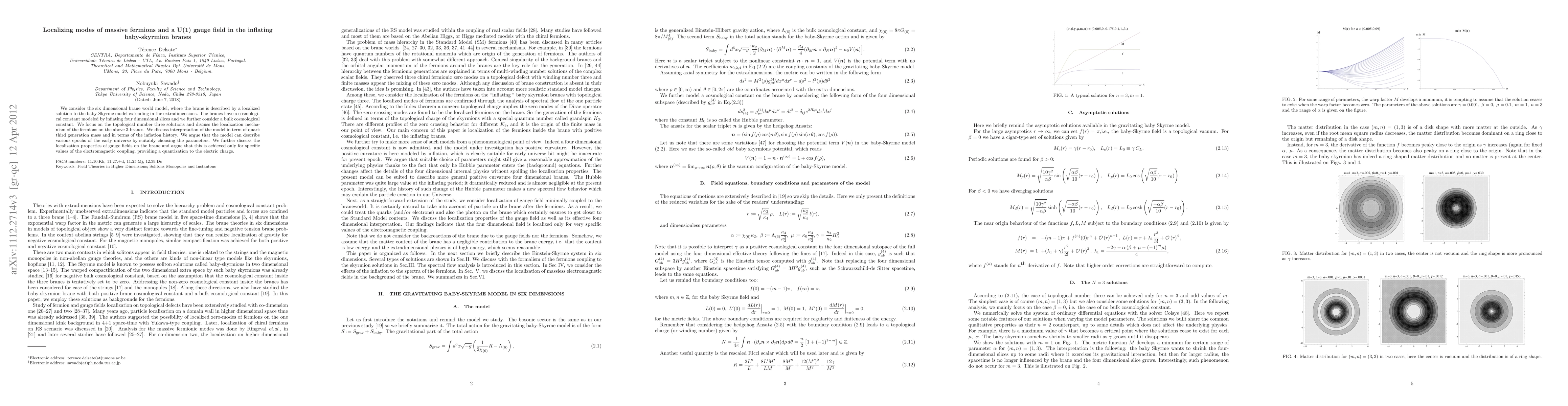 We consider the six dimensional brane world model, where the brane is described by a localized solution to the baby-Skyrme model extending in the extradimensions. The branes have a cosmological constant modeled by inflating four dimensional slices and we further consider a bulk cosmological constant. We focus on the topological number three solutions and discuss the localization mechanism of the fermions on the above 3-branes. We discuss interpretation of the model in term of quark third generation mass and in terms of the inflation history. We argue that it is possible to track the phases of inflation in our model by suitably choosing the parameters. We further discuss the localization properties of gauge fields on the brane and argue that this is achieved only for specific values of the electromagnetic coupling, providing a quantization to the electric charge.