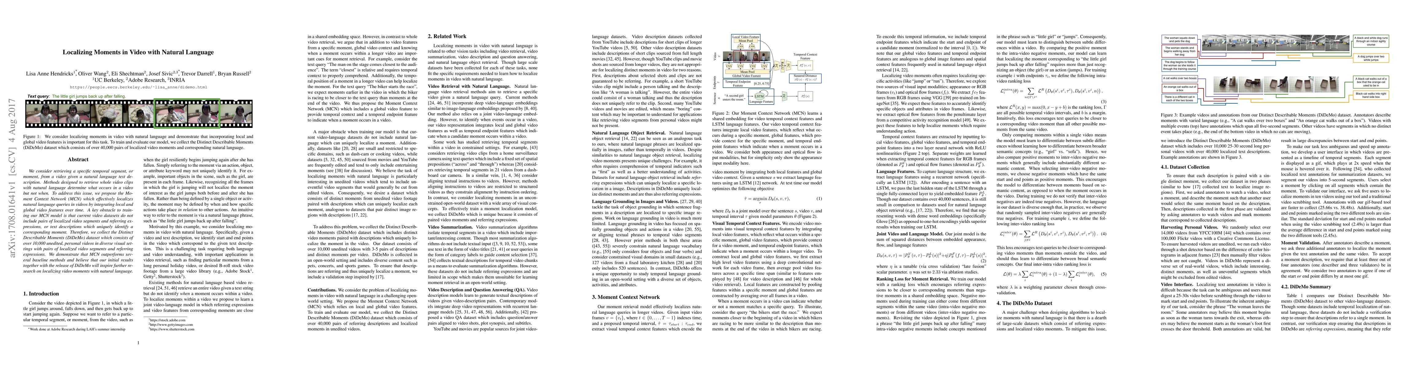 This paper proposes the Moment Context Network (MCN) to localize specific moments in videos based on natural language descriptions. To address the lack of training data, the authors create the DiDeMo dataset, which pairs localized video segments with descriptive text, and show that MCN outperforms existing methods.