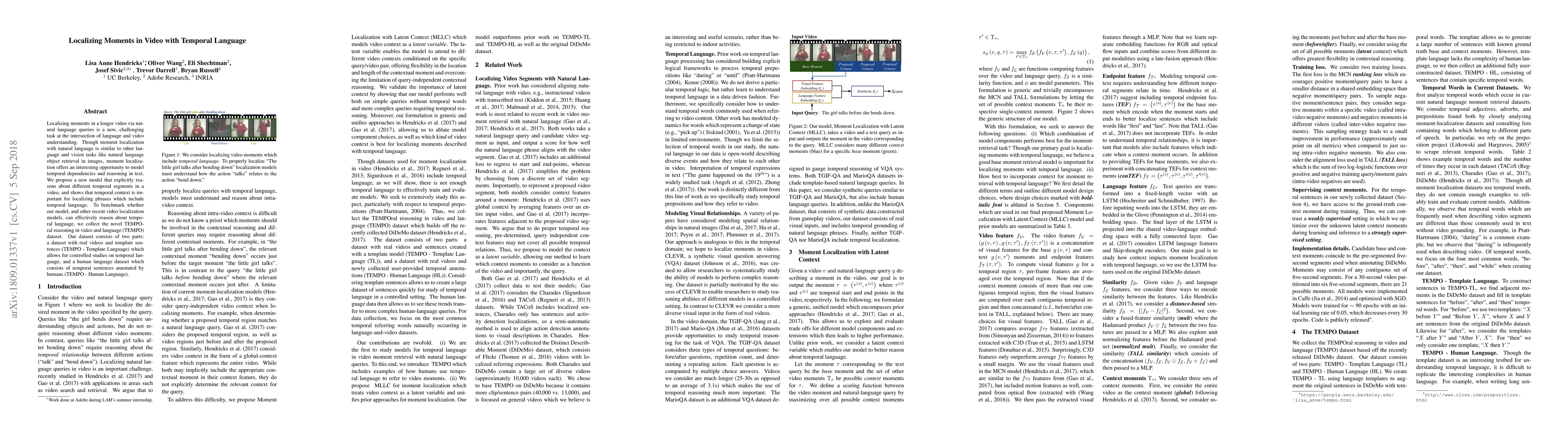 This paper proposes a new model for localizing moments in videos using temporal language, highlighting the importance of temporal context. To evaluate the model, the authors introduce the TEMPO dataset, which includes both controlled template sentences and human-annotated temporal sentences.