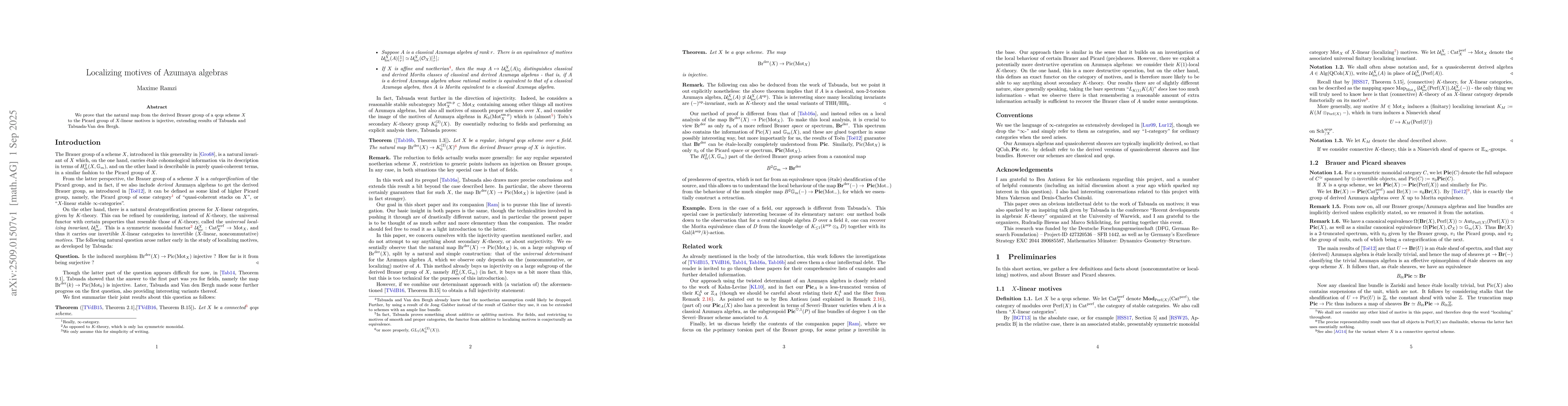 We prove that the natural map from the derived Brauer group of a qcqs scheme $X$ to the Picard group of $X$-linear motives is injective, extending results of Tabuada and Tabuada-Van den Bergh.