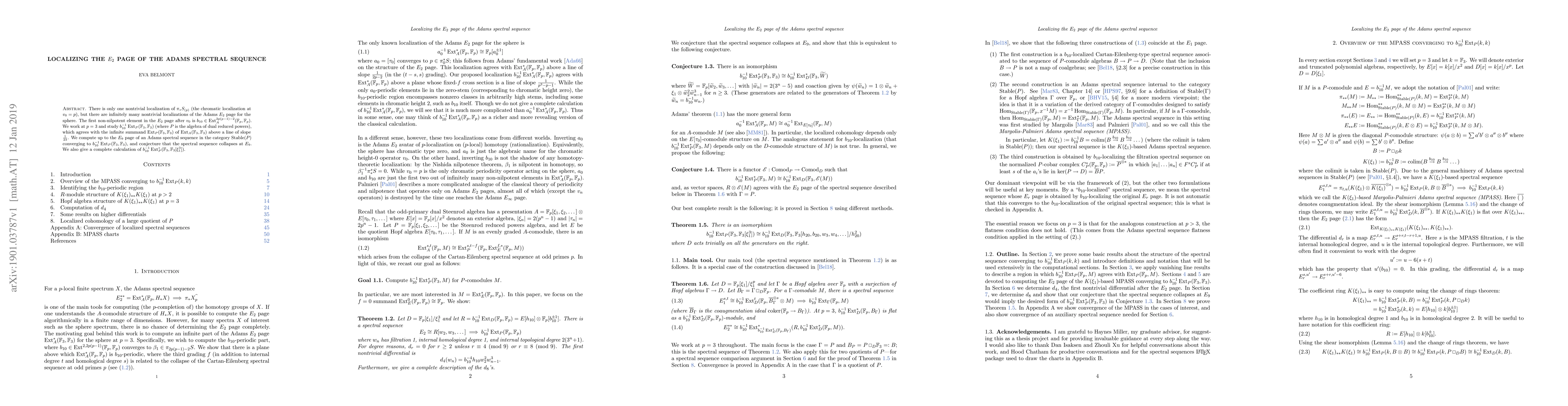 There is only one nontrivial localization of $\pi_*S_{(p)}$ (the chromatic localization at $v_0=p$), but there are infinitely many nontrivial localizations of the Adams $E_2$ page for the sphere. The first non-nilpotent element in the $E_2$ page after $v_0$ is $b_{10}\in \mathrm{Ext}_A^{2p(p-1)-2}(\mathbb{F}_p,\mathbb{F}_p)$. We work at $p=3$ and study $b_{10}^{-1}\mathrm{Ext}_P(\mathbb{F}_3,\mathbb{F}_3)$ (where $P$ is the algebra of dual reduced powers), which agrees with the infinite summand $\mathrm{Ext}_P(\mathbb{F}_3,\mathbb{F}_3)$ of $\mathrm{Ext}_A(\mathbb{F}_3,\mathbb{F}_3)$ above a line of slope ${1\over 23}$. We compute up to the $E_9$ page of an Adams spectral sequence in the category $\mathrm{Stable}(P)$ converging to $b_{10}^{-1}\mathrm{Ext}_P(\mathbb{F}_3,\mathbb{F}_3)$, and conjecture that the spectral sequence collapses at $E_9$. We also give a complete calculation of $b_{10}^{-1}\mathrm{Ext}_P^*(\mathbb{F}_3,\mathbb{F}_3[\xi_1^3])$.