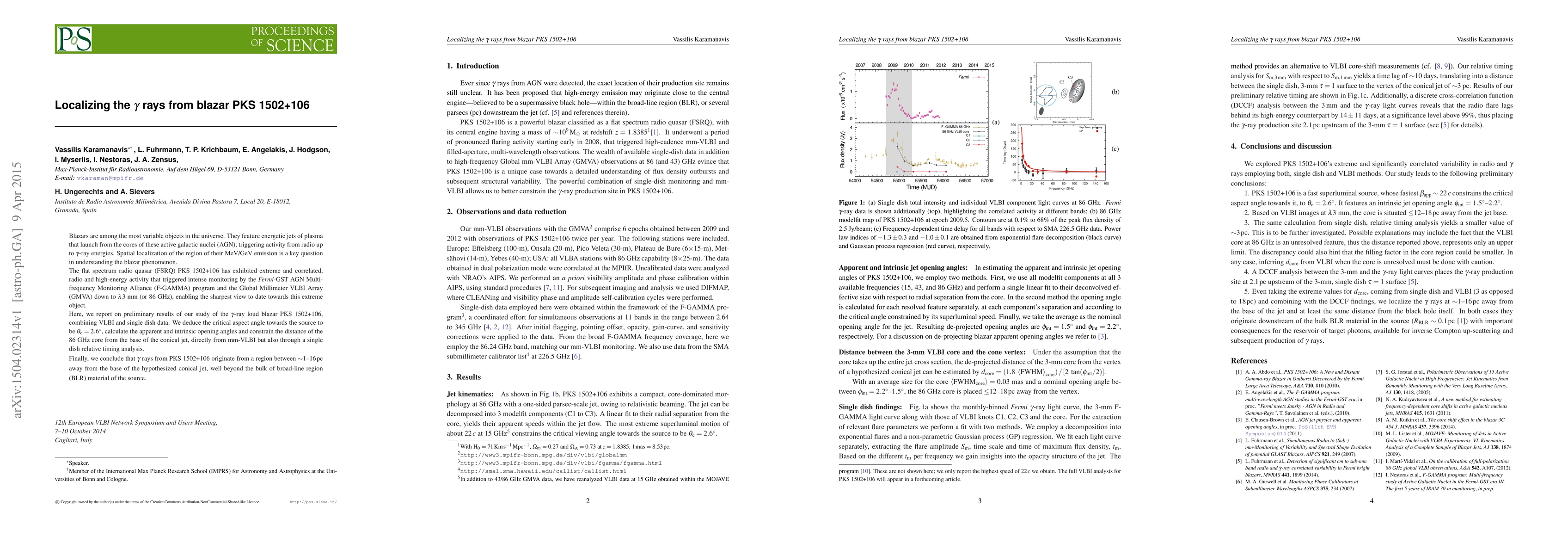 Researchers used a combination of VLBI and single dish data to study blazar PKS 1502+106 and found that gamma rays originate from a region between 1-16 parsecs away from the base of its conical jet.