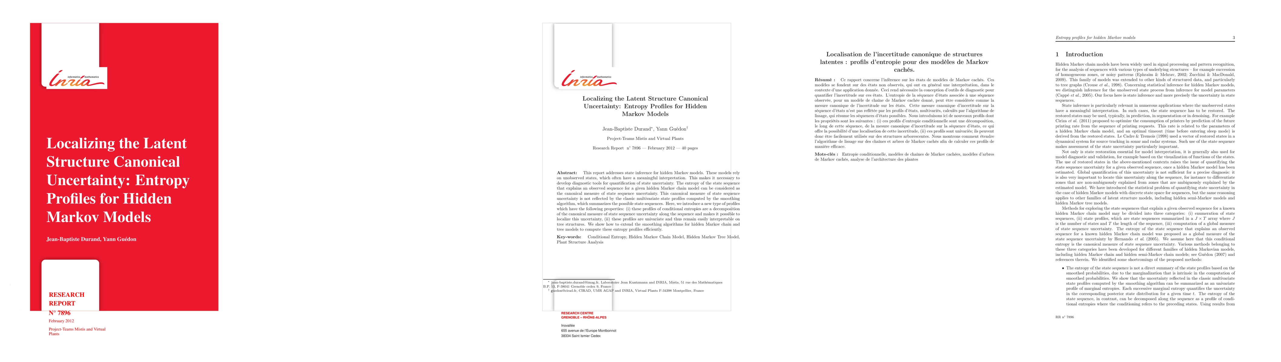 This report addresses state inference for hidden Markov models. These models rely on unobserved states, which often have a meaningful interpretation. This makes it necessary to develop diagnostic tools for quantification of state uncertainty. The entropy of the state sequence that explains an observed sequence for a given hidden Markov chain model can be considered as the canonical measure of state sequence uncertainty. This canonical measure of state sequence uncertainty is not reflected by the classic multivariate state profiles computed by the smoothing algorithm, which summarizes the possible state sequences. Here, we introduce a new type of profiles which have the following properties: (i) these profiles of conditional entropies are a decomposition of the canonical measure of state sequence uncertainty along the sequence and makes it possible to localize this uncertainty, (ii) these profiles are univariate and thus remain easily interpretable on tree structures. We show how to extend the smoothing algorithms for hidden Markov chain and tree models to compute these entropy profiles efficiently.