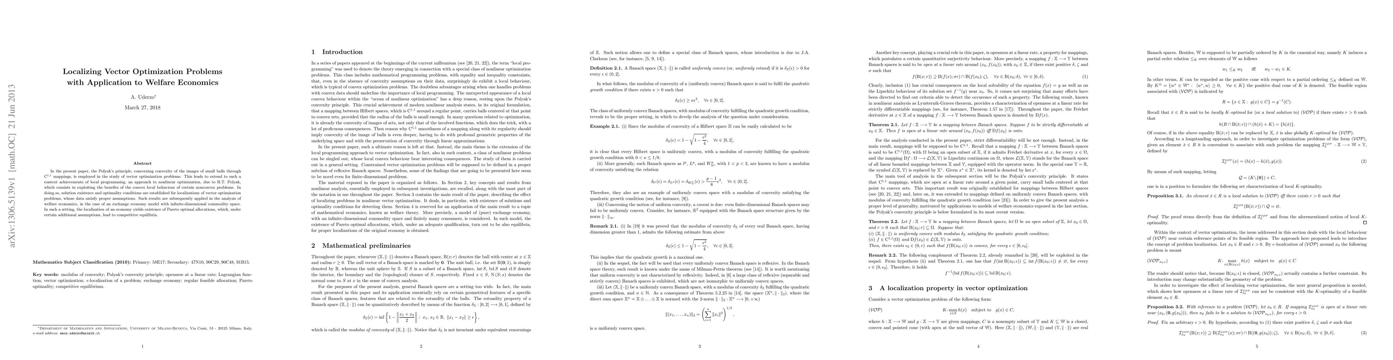 In the present paper, the Polyak's principle, concerning convexity of the images of small balls through C1,1 mappings, is employed in the study of vector optimization problems. This leads to extend to such a context achievements of local programming, an approach to nonlinear optimization, due to B.T. Polyak, which consists in exploiting the benefits of the convex local behaviour of certain nonconvex problems. In doing so, solution existence and optimality conditions are established for localizations of vector optimization problems, whose data satisfy proper assumptions. Such results are subsequently applied in the analysis of welfare economics, in the case of an exchange economy model with infinite-dimensional commodity space. In such a setting, the localization of an economy yields existence of Pareto optimal allocations, which, under certain additional assumptions, lead to competitive equilibria.