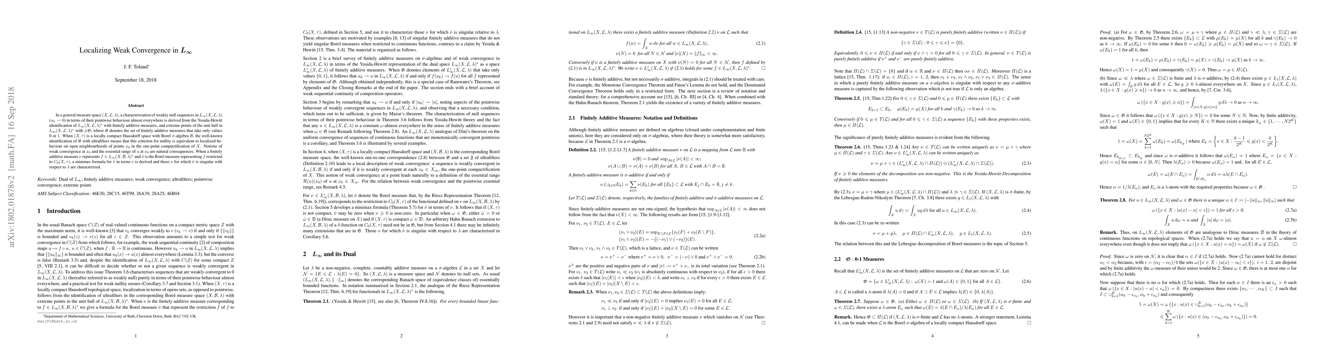 In a general measure space $(X,\mathcal L,\lambda)$, a characterization of weakly null sequences in $L_\infty (X,\mathcal L,\lambda)$ ($u_k \rightharpoonup 0$) in terms of their pointwise behaviour almost everywhere is derived from the Yosida-Hewitt identification of $L_\infty (X,\mathcal L,\lambda)^*$ with finitely additive measures, and extreme points of the unit ball in $L_\infty (X,\mathcal L,\lambda)^*$ with $\pm \mathfrak G$, where $\mathfrak G$ denotes the set of finitely additive measures that take only values 0 or $ 1$. When $(X,\tau)$ is a locally compact Hausdorff space with Borel $\sigma$-algebra $\mathcal B$, the well-known identification of $\mathfrak G$ with ultrafilters means that this criterion for nullity is equivalent to localized behaviour on open neighbourhoods of points $x_0$ in the one-point compactification of $X$. Notions of weak convergence at $x_0$ and the essential range of $u$ at $x_0$ are natural consequences.When a finitely additive measure $\nu$ represents $f \in L_\infty(X, \mathcal B, \lambda)^*$ and $\hat \nu$ is the Borel measure representing $f$ restricted to $C_0(X,\tau)$, a minimax formula for $\hat \nu$ in terms $\nu$ is derived and those $\nu$ for which $\hat \nu$ is singular with respect to $\lambda$ are characterized.