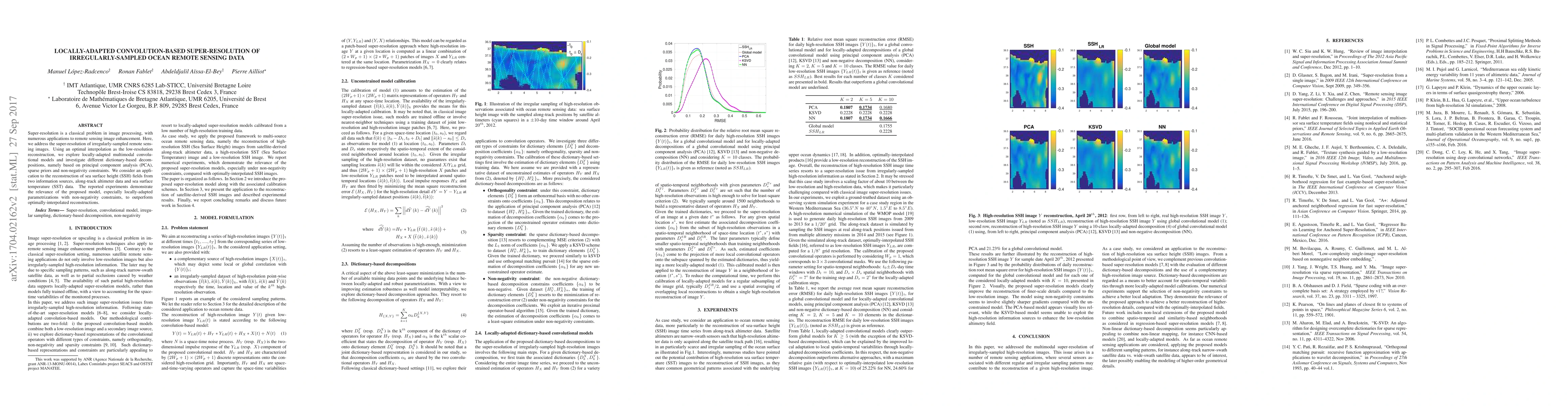 This paper proposes a locally-adapted convolution-based super-resolution model for enhancing irregularly-sampled remote sensing images, specifically for sea surface height reconstruction using altimeter and sea surface temperature data. The method outperforms traditional interpolation by incorporating PCA, sparse priors, and non-negativity constraints.