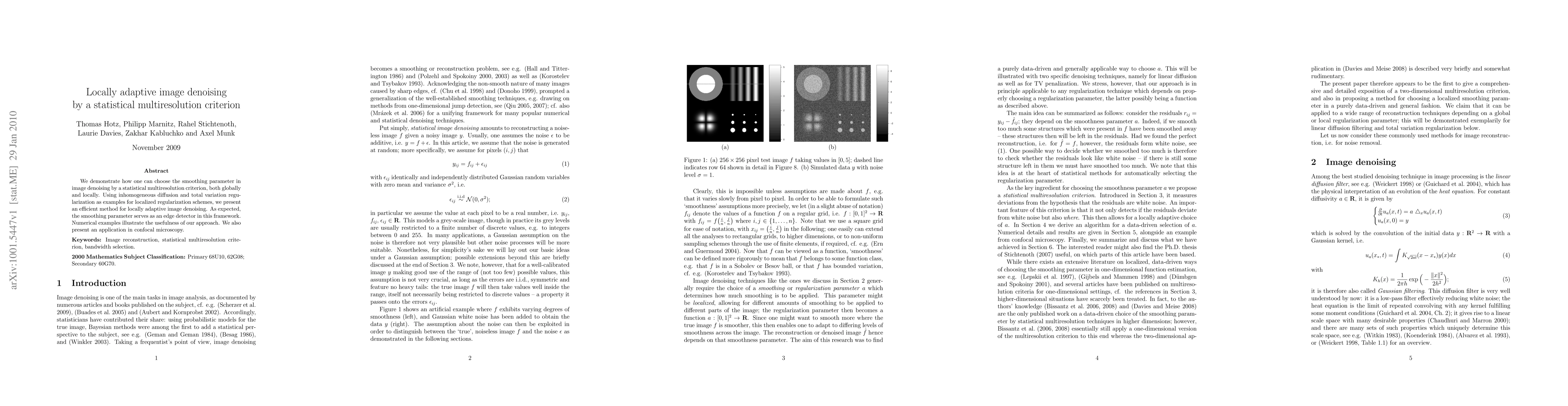 This paper proposes a locally adaptive image denoising method using a statistical multiresolution criterion, employing inhomogeneous diffusion and total variation regularization. The method efficiently adjusts the smoothing parameter, functioning as an edge detector, and is demonstrated through numerical examples and confocal microscopy applications.