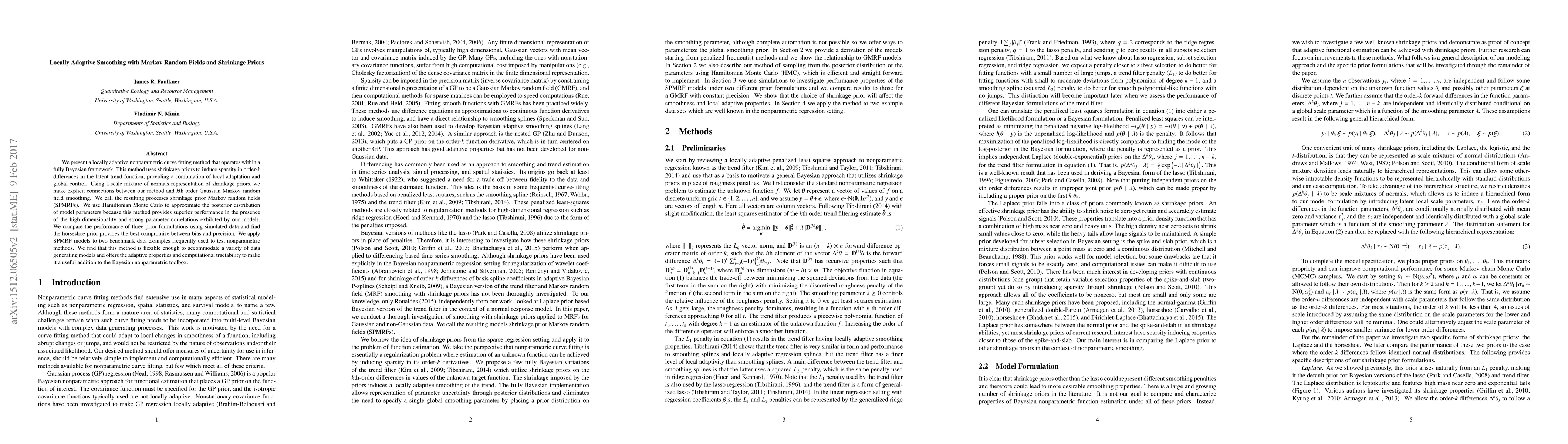 We present a locally adaptive nonparametric curve fitting method that operates within a fully Bayesian framework. This method uses shrinkage priors to induce sparsity in order-k differences in the latent trend function, providing a combination of local adaptation and global control. Using a scale mixture of normals representation of shrinkage priors, we make explicit connections between our method and kth order Gaussian Markov random field smoothing. We call the resulting processes shrinkage prior Markov random fields (SPMRFs). We use Hamiltonian Monte Carlo to approximate the posterior distribution of model parameters because this method provides superior performance in the presence of the high dimensionality and strong parameter correlations exhibited by our models. We compare the performance of three prior formulations using simulated data and find the horseshoe prior provides the best compromise between bias and precision. We apply SPMRF models to two benchmark data examples frequently used to test nonparametric methods. We find that this method is flexible enough to accommodate a variety of data generating models and offers the adaptive properties and computational tractability to make it a useful addition to the Bayesian nonparametric toolbox.