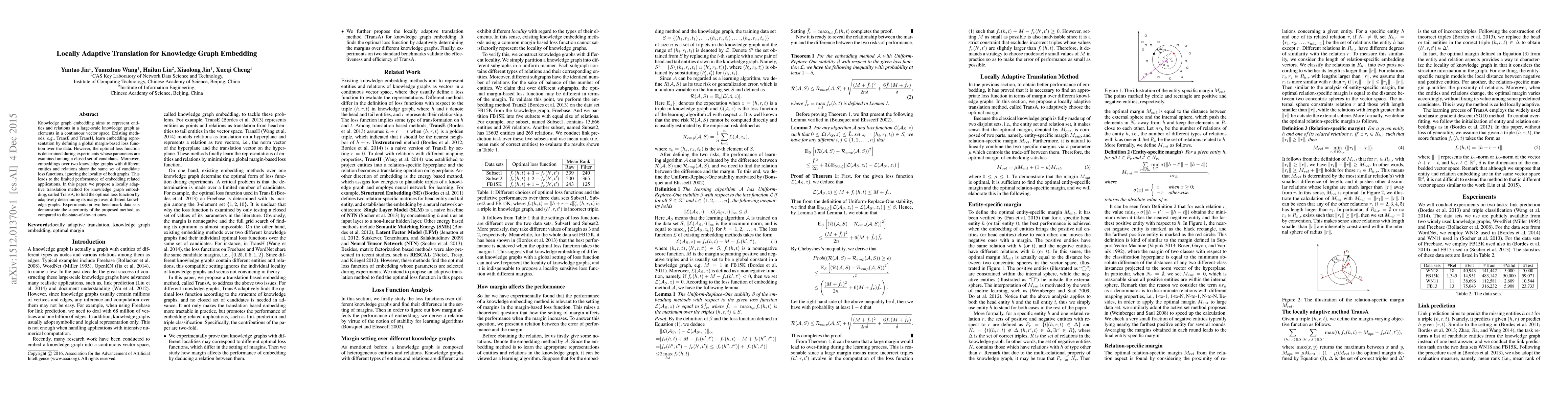 This paper introduces TransA, a locally adaptive translation method for knowledge graph embedding, which adaptively determines the optimal loss function margin for different knowledge graphs, improving performance over existing global methods. Experiments on benchmark datasets show TransA outperforms state-of-the-art approaches.