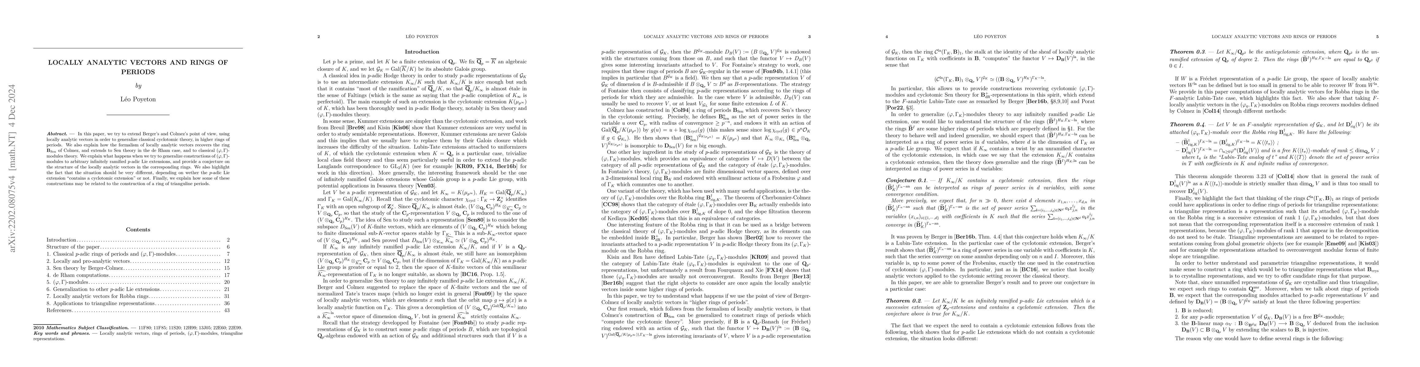 Let $K$ be a finite extension of $\mathbf{Q}_p$. In this paper, we try to extend Berger's and Colmez's point of view, using locally analytic vectors in order to generalize classical cyclotomic theory, in higher rings of periods. We also provide a construction of analogs of the ring $\mathbf{B}_{Sen}$ of Colmez, one of which computes Sen theory in the de Rham case, and one which computes classical $(\varphi,\Gamma)$-modules theory. We explain what happens when we try to generalize constructions of $(\varphi,\Gamma)$-modules to arbitrary infinitely ramified p-adic Lie extensions, and provide a conjecture on the structure of the locally analytic vectors in the corresponding rings. In particular, we highlight the fact that the situation should be very different, depending on wether the $p$-adic Lie extension contains a cyclotomic extension or not. Finally, we explain how some of these constructions may be related to the construction of a potential ring of trianguline periods.