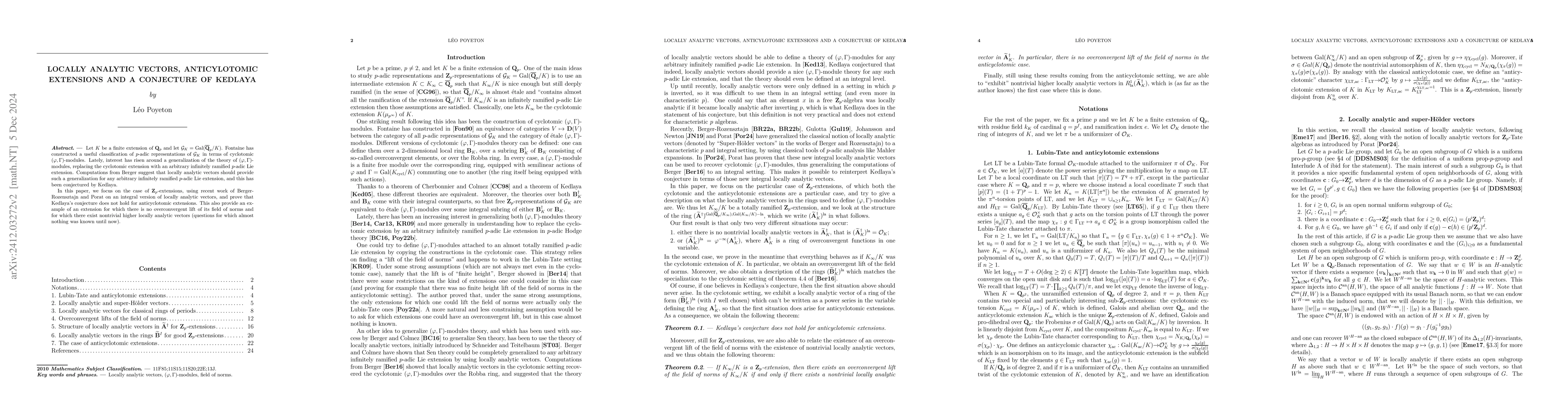 This paper examines Kedlaya's conjecture regarding the use of locally analytic vectors to generalize the theory of cyclotomic $(\varphi,\Gamma)$-modules to arbitrary infinitely ramified $p$-adic Lie extensions. It disproves the conjecture for anticyclotomic extensions and provides an example where nontrivial higher locally analytic vectors exist without an overconvergent lift of the field of norms.
