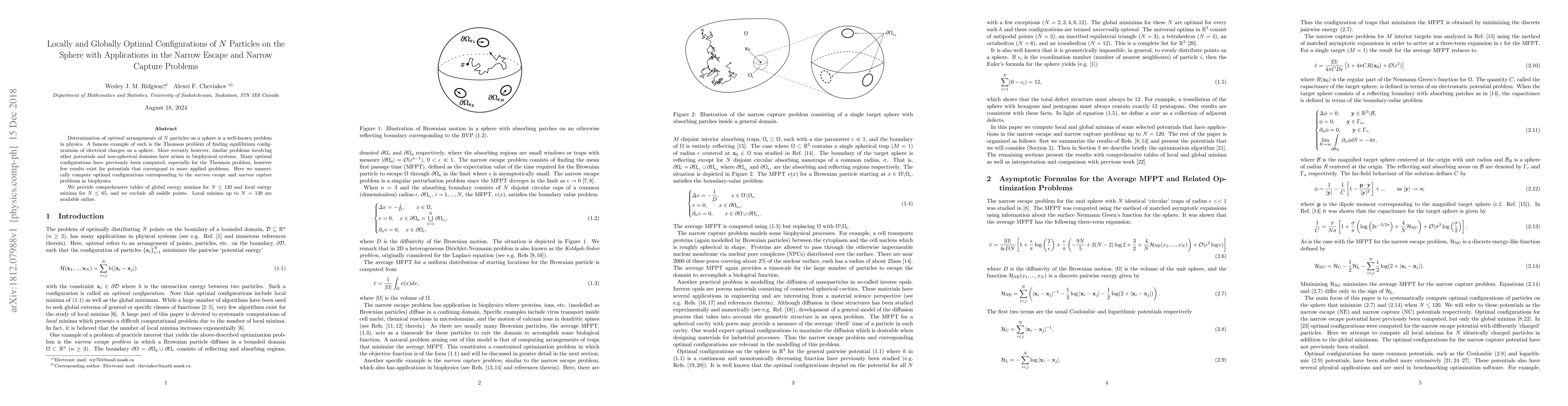 Determination of \emph{optimal} arrangements of $N$ particles on a sphere is a well-known problem in physics. A famous example of such is the Thomson problem of finding equilibrium configurations of electrical charges on a sphere. More recently however, similar problems involving other potentials and non-spherical domains have arisen in biophysical systems. Many optimal configurations have previously been computed, especially for the Thomson problem, however few results exist for potentials that correspond to more applied problems. Here we numerically compute optimal configurations corresponding to the \emph{narrow escape} and \emph{narrow capture} problems in biophysics. We provide comprehensive tables of global energy minima for $N\leq120$ and local energy minima for $N\leq65$, and we exclude all saddle points. Local minima up to $N=120$ are available online.