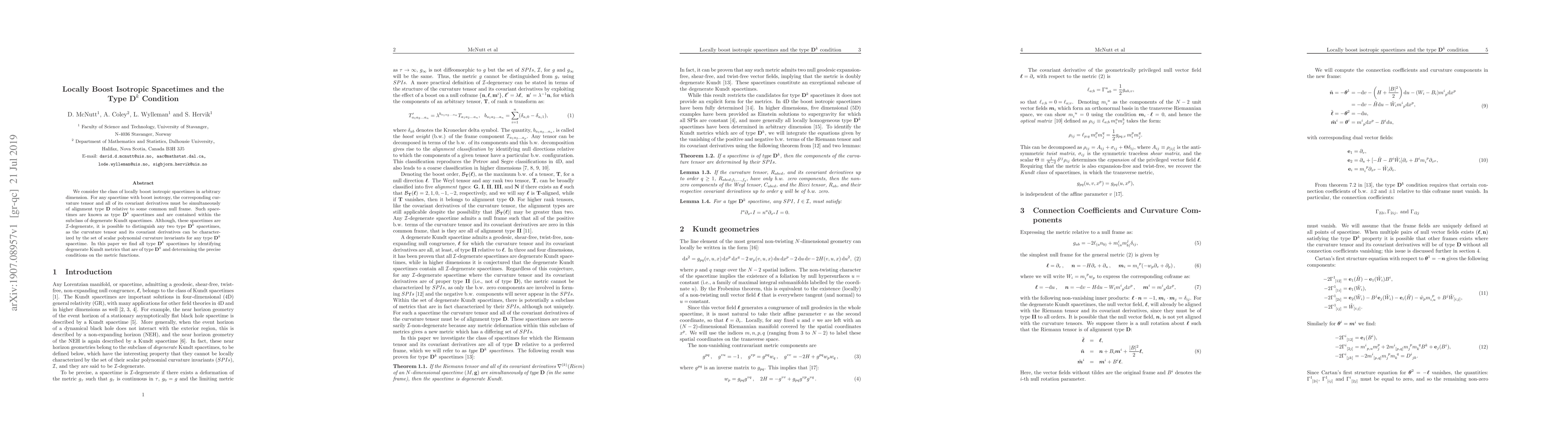 We consider the class of locally boost isotropic spacetimes in arbitrary dimension. For any spacetime with boost isotropy, the corresponding curvature tensor and all of its covariant derivatives must be simultaneously of alignment type ${\bf D}$ relative to some common null frame. Such spacetimes are known as type ${\bf D}^k$ spacetimes and are contained within the subclass of degenerate Kundt spacetimes. Although, these spacetimes are $\mathcal{I}$-degenerate, it is possible to distinguish any two type ${\bf D}^k$ spacetimes, as the curvature tensor and its covariant derivatives can be characterized by the set of scalar polynomial curvature invariants for any type ${\bf D}^k$ spacetime. In this paper we find all type ${\bf D}^k$ spacetimes by identifying degenerate Kundt metrics that are of type ${\bf D}^k$ and determining the precise conditions on the metric functions.