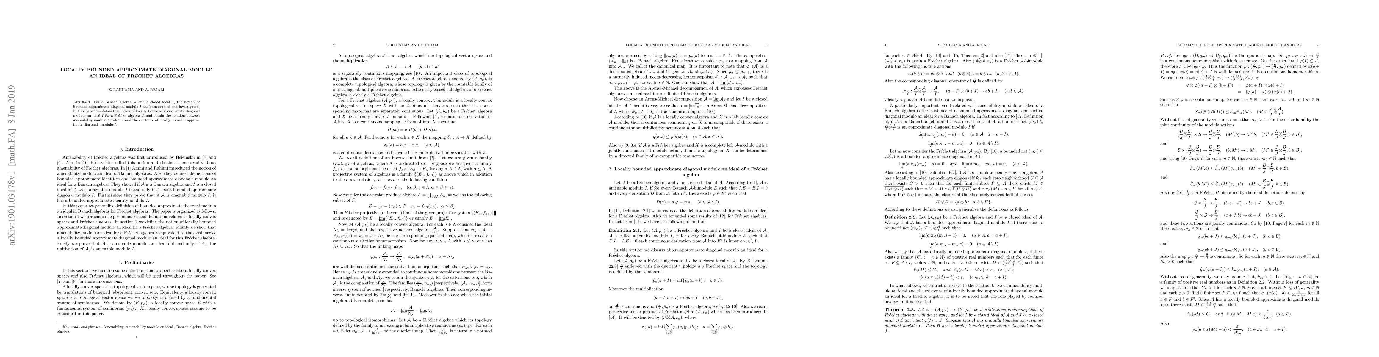 This paper investigates the concept of locally bounded approximate diagonal modulo an ideal in Frechet algebras, establishing a relation between amenability and its existence, with implications for Banach algebra theory.