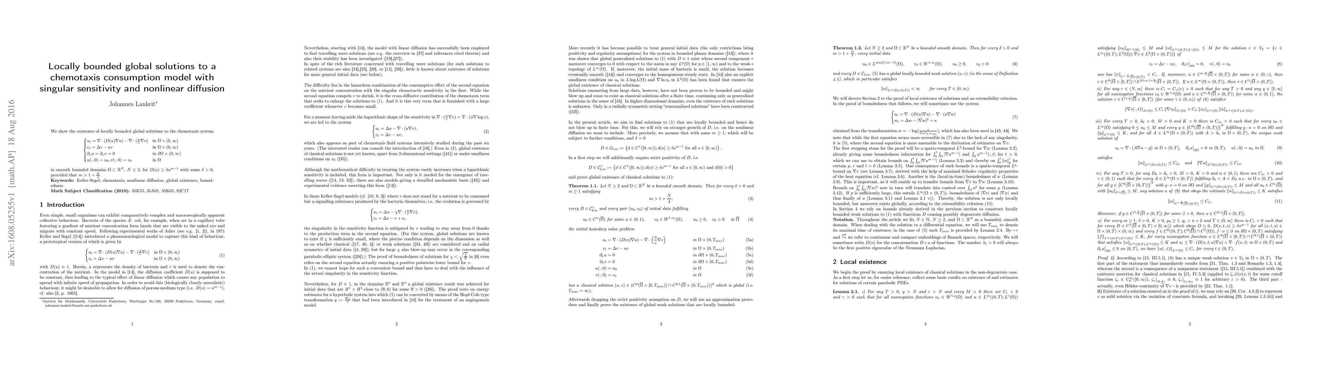 This paper proves the existence of bounded solutions to a chemotaxis model with specific conditions on diffusion and sensitivity functions.