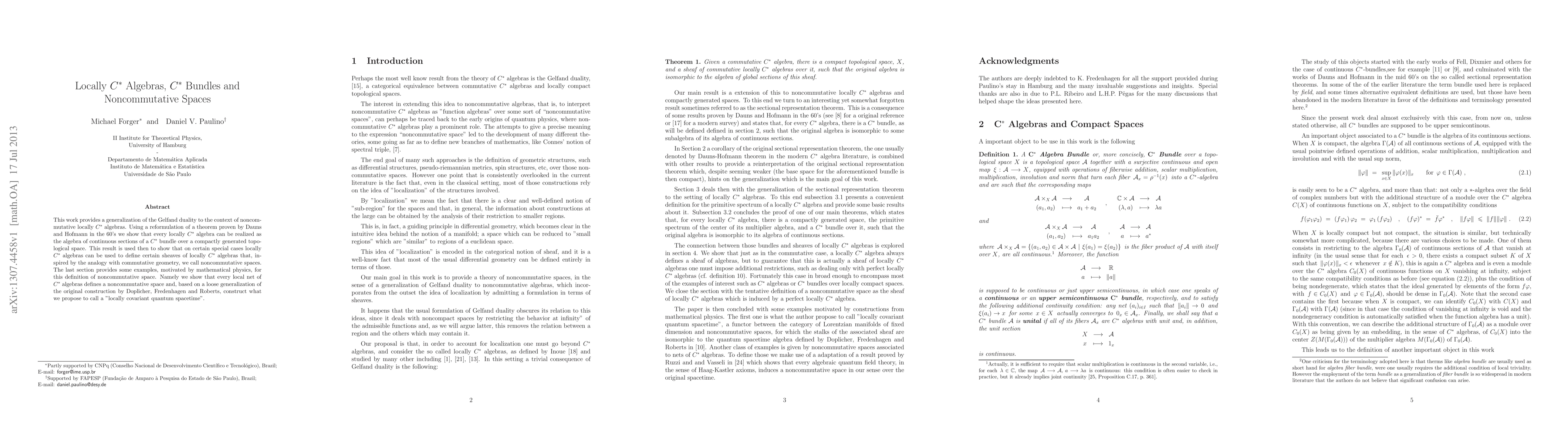 This paper generalizes Gelfand duality to noncommutative locally $C^*$ algebras, demonstrating that they can be realized as sections of $C^*$ bundles over compactly generated spaces, and introduces the concept of noncommutative spaces defined by sheaves of locally $C^*$ algebras, with examples inspired by mathematical physics including locally covariant quantum spacetimes.
