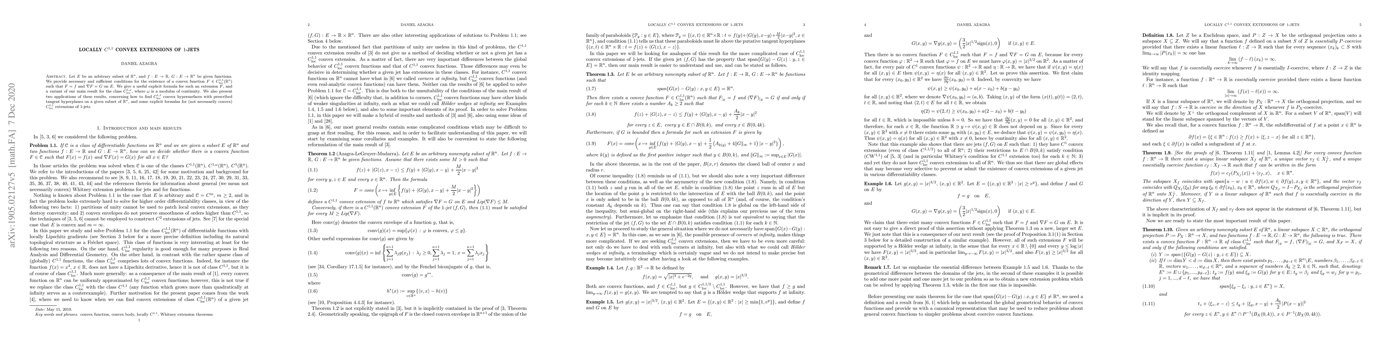 This paper provides necessary and sufficient conditions for extending a given pair of functions $(f, G)$ over a subset $E$ of $\mathbb{R}^n$ to a locally $C^{1,1}$ convex function $F$. It also offers an explicit formula for such extensions and discusses applications in finding convex hypersurfaces with prescribed tangents.