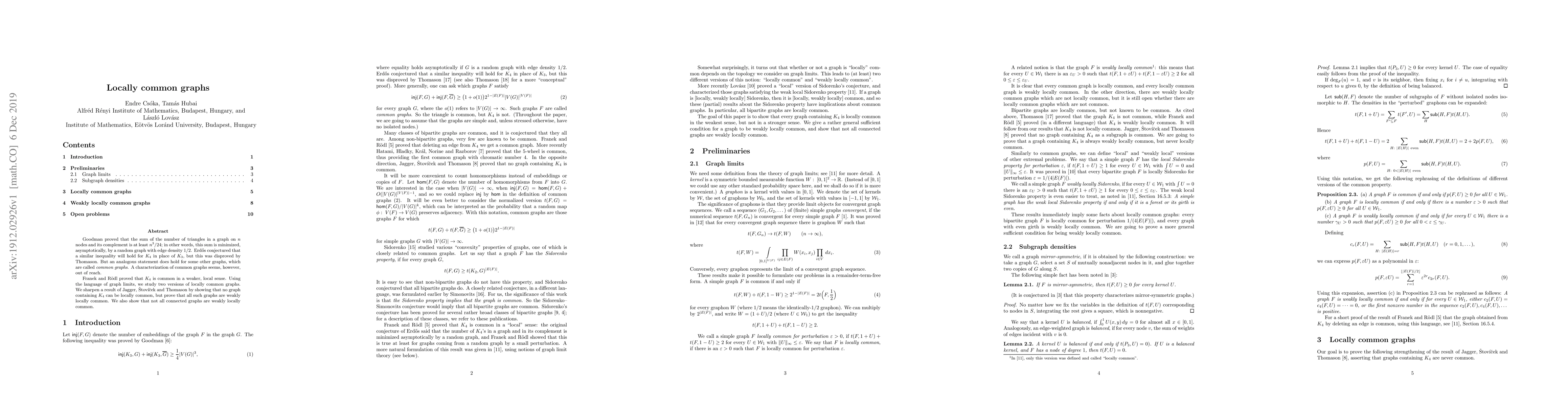 Goodman proved that the sum of the number of triangles in a graph on $n$ nodes and its complement is at least $n^3/24$; in other words, this sum is minimized, asymptotically, by a random graph with edge density $1/2$. Erd\H{o}s conjectured that a similar inequality will hold for $K_4$ in place of $K_3$, but this was disproved by Thomason. But an analogous statement does hold for some other graphs, which are called {\it common graphs}. A characterization of common graphs seems, however, out of reach. Franek and R\"odl proved that $K_4$ is common in a weaker, local sense. Using the language of graph limits, we study two versions of locally common graphs. We sharpen a result of Jagger, \v{S}tov\'{\i}\v{c}ek and Thomason by showing that no graph containing $K_4$ can be locally common, but prove that all such graphs are weakly locally common. We also show that not all connected graphs are weakly locally common.