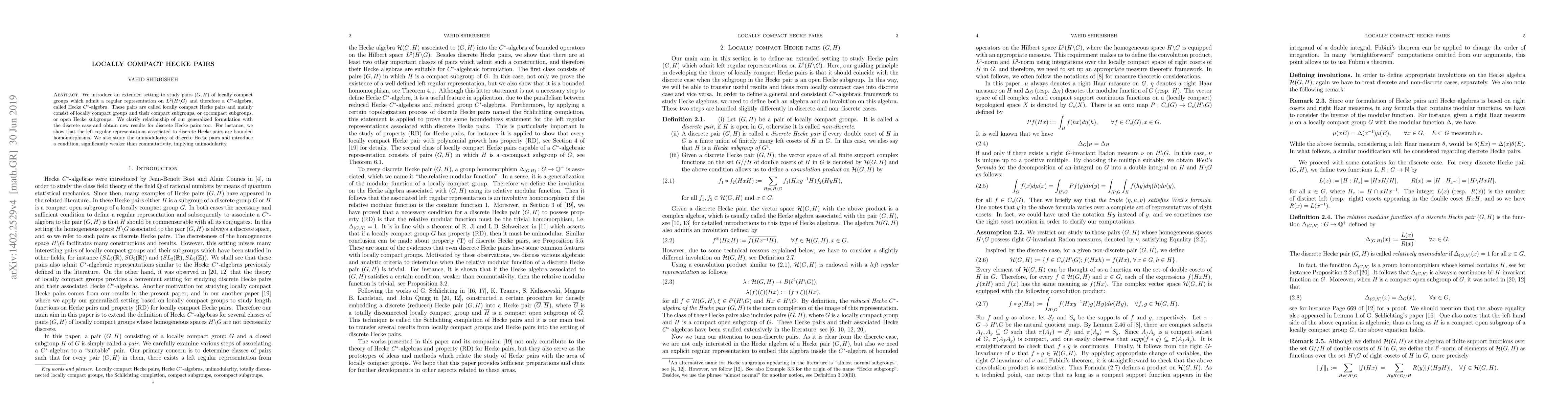 This paper introduces a framework for studying locally compact Hecke pairs, extending their regular representation on $L^2(H\backslash G)$ to form $C^*$-algebras, encompassing various groups studied in noncommutative harmonic analysis. It clarifies relationships between locally compact and discrete Hecke pairs, proving that the left regular representations in discrete cases are bounded homomorphisms and providing criteria for relative unimodularity.