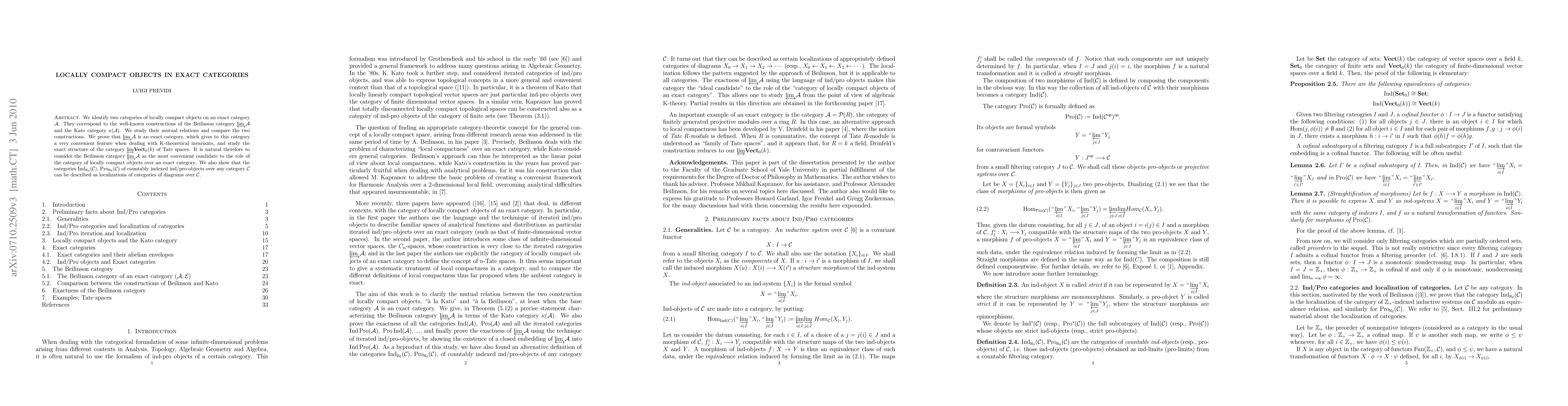 This paper identifies two categories of locally compact objects in an exact category A, corresponding to the Beilinson and Kato constructions, and studies their relations. The Beilinson category lim A is proven to be exact, making it a convenient category for K-theoretical invariants, thus positioning it as the best candidate for locally compact objects in exact categories. Additionally, it describes Ind_{aleph_0}(C) and Pro_{aleph_0}(C) as localizations of diagram categories over C.