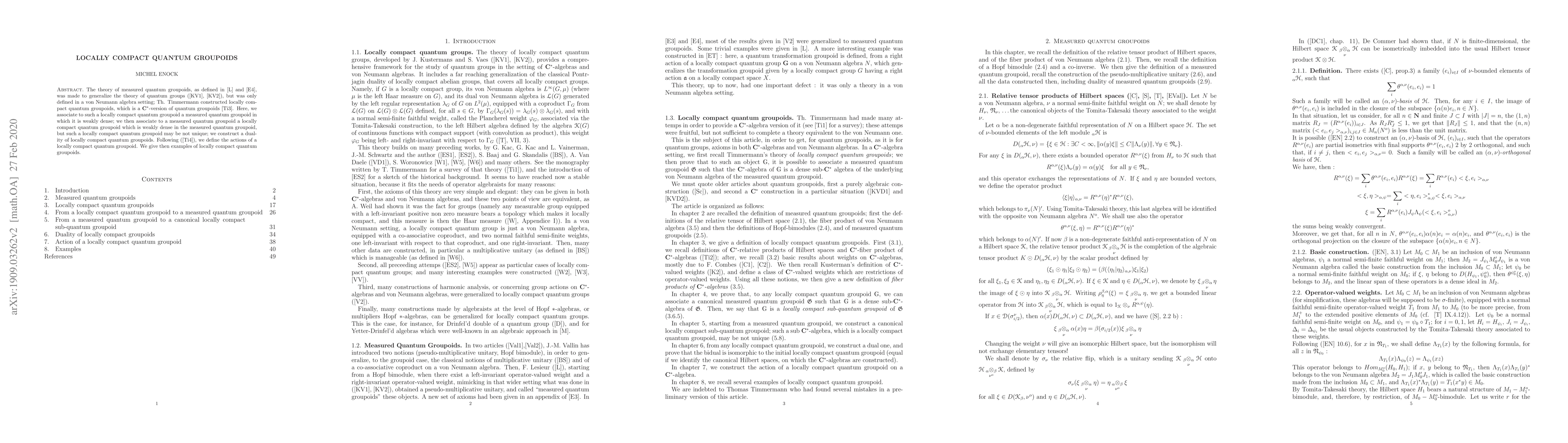 This paper constructs locally compact quantum groupoids as a C*-algebraic version of quantum groupoids and establishes a duality. It also associates measured quantum groupoids to locally compact quantum groupoids and provides examples to illustrate these concepts.