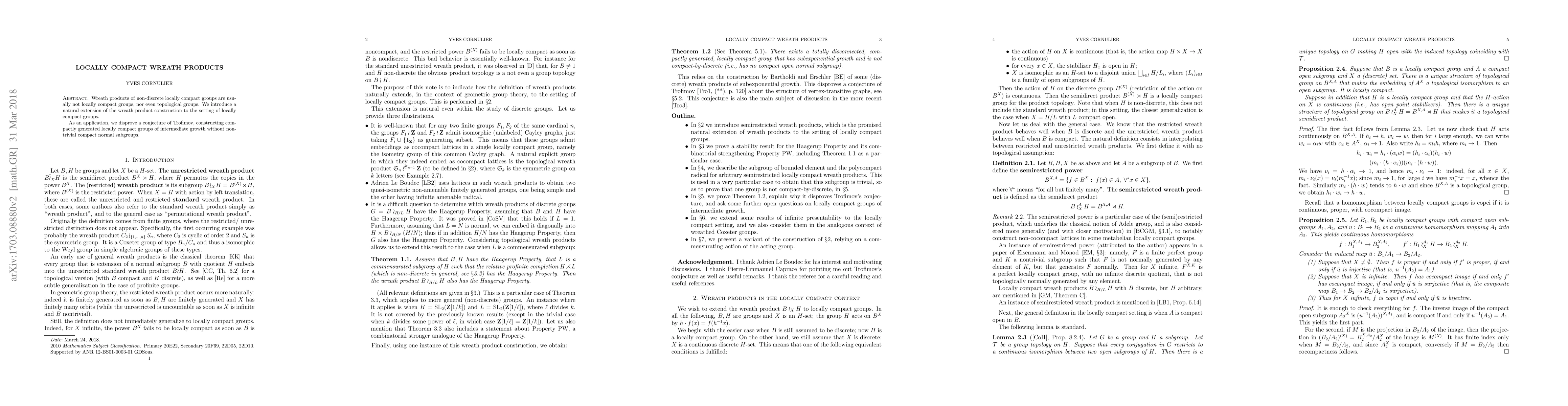 This paper extends the wreath product construction to locally compact groups, addressing the issue that traditional wreath products often fail to maintain local compactness. It uses this extension to disprove Trofimov's conjecture by constructing compactly generated locally compact groups of intermediate growth without nontrivial compact normal subgroups.