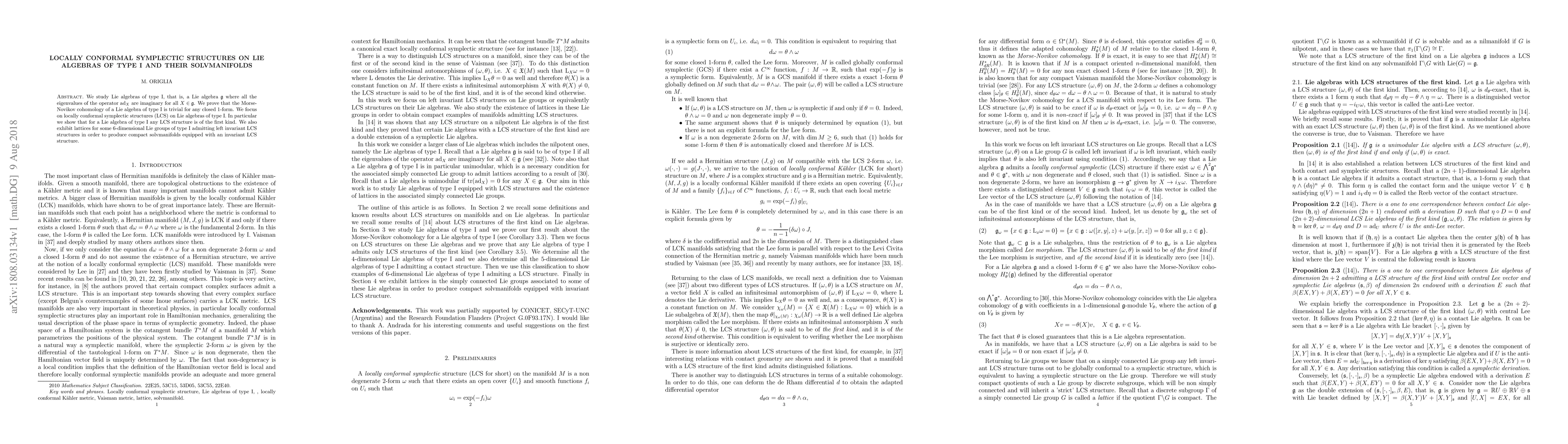 Summary: This paper investigates Lie algebras of type I and proves that their Morse-Novikov cohomology is trivial for closed 1-forms. It demonstrates that any locally conformal symplectic (LCS) structure on these Lie algebras is of the first kind and constructs compact solvmanifolds with invariant LCS structures for specific 6-dimensional Lie groups.