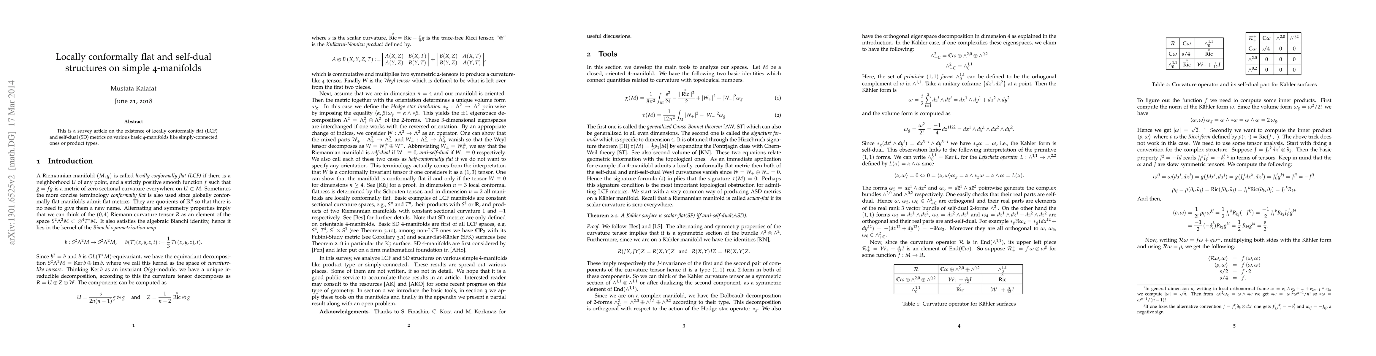 This paper surveys the existence of locally conformally flat (LCF) and self-dual (SD) metrics on simple 4-manifolds, including simply-connected and product types, exploring their geometric and topological properties.