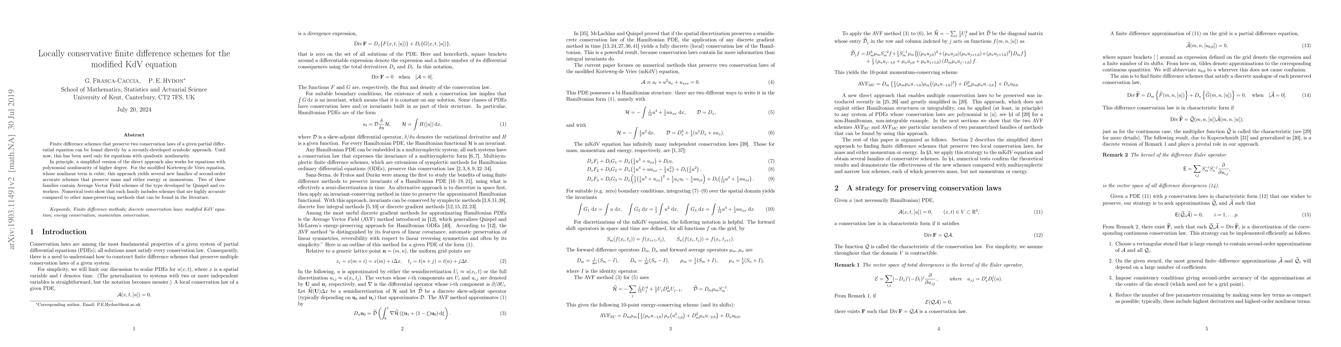 Finite difference schemes that preserve two conservation laws of a given partial differential equation can be found directly by a recently-developed symbolic approach. Until now, this has been used only for equations with quadratic nonlinearity. In principle, a simplified version of the direct approach also works for equations with polynomial nonlinearity of higher degree. For the modified Korteweg-de Vries equation, whose nonlinear term is cubic, this approach yields several new families of second-order accurate schemes that preserve mass and either energy or momentum. Two of these families contain Average Vector Field schemes of the type developed by Quispel and coworkers. Numerical tests show that each family includes schemes that are highly accurate compared to other mass-preserving methods that can be found in the literature.