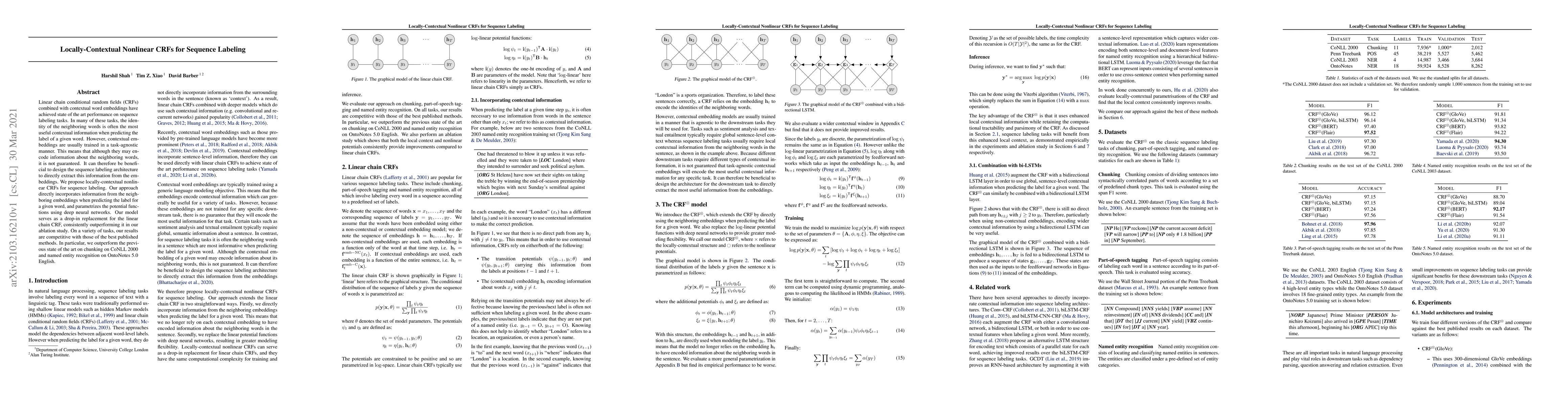 This paper proposes locally-contextual nonlinear CRFs to enhance sequence labeling by directly incorporating neighboring word information from contextual embeddings. The model outperforms linear chain CRFs and achieves state-of-the-art results on chunking and named entity recognition tasks.