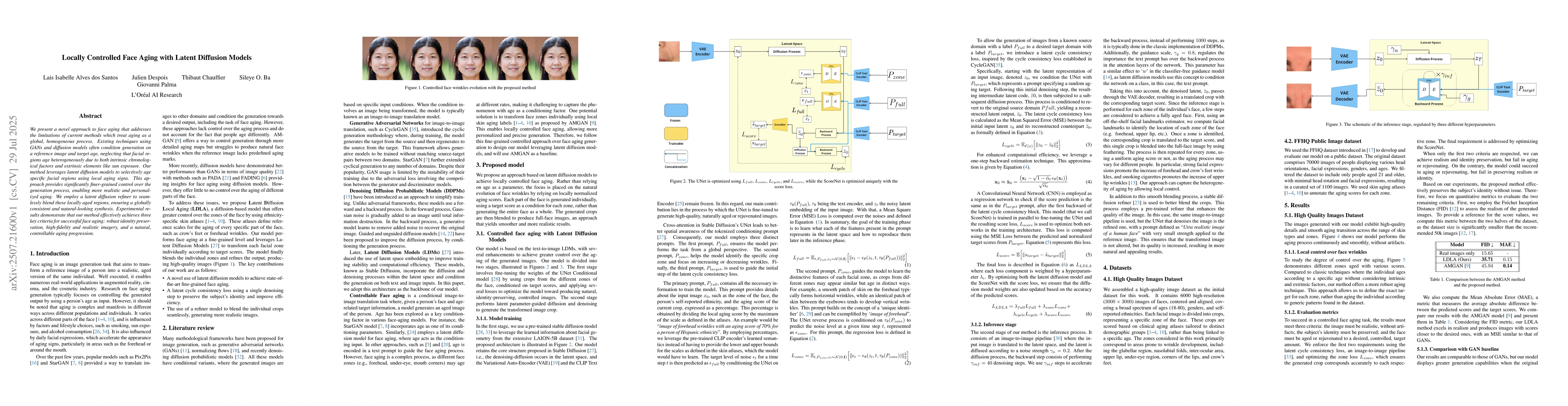 We present a novel approach to face aging that addresses the limitations of current methods which treat aging as a global, homogeneous process. Existing techniques using GANs and diffusion models often condition generation on a reference image and target age, neglecting that facial regions age heterogeneously due to both intrinsic chronological factors and extrinsic elements like sun exposure. Our method leverages latent diffusion models to selectively age specific facial regions using local aging signs. This approach provides significantly finer-grained control over the generation process, enabling more realistic and personalized aging. We employ a latent diffusion refiner to seamlessly blend these locally aged regions, ensuring a globally consistent and natural-looking synthesis. Experimental results demonstrate that our method effectively achieves three key criteria for successful face aging: robust identity preservation, high-fidelity and realistic imagery, and a natural, controllable aging progression.