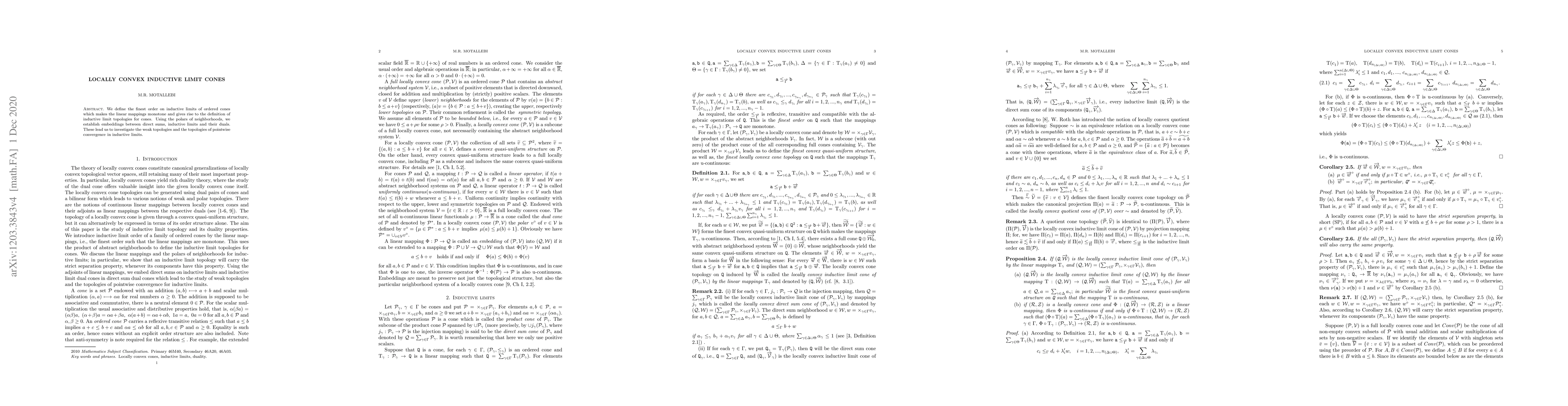 This paper introduces a finest order on inductive limits of ordered cones, ensuring monotonicity of linear mappings and defining associated topologies. It also explores embeddings between direct sums, inductive limits, and their duals, investigating weak topologies and pointwise convergence in these contexts.