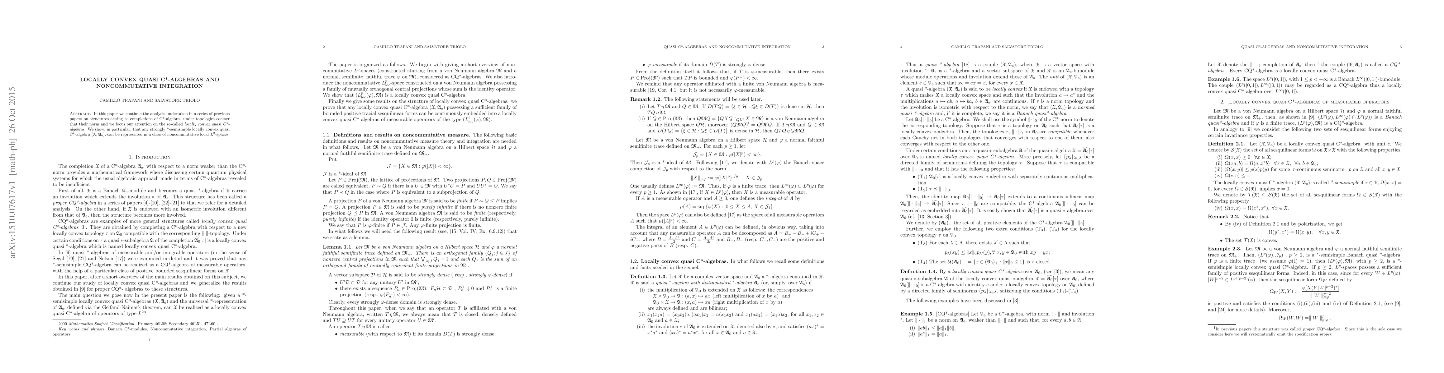 This paper explores locally convex quasi C*-algebras, completing previous work on structures derived from C*-algebras under coarser topologies. It demonstrates that strongly *-semisimple locally convex quasi C*-algebras can be represented in noncommutative local $L^2$-spaces.