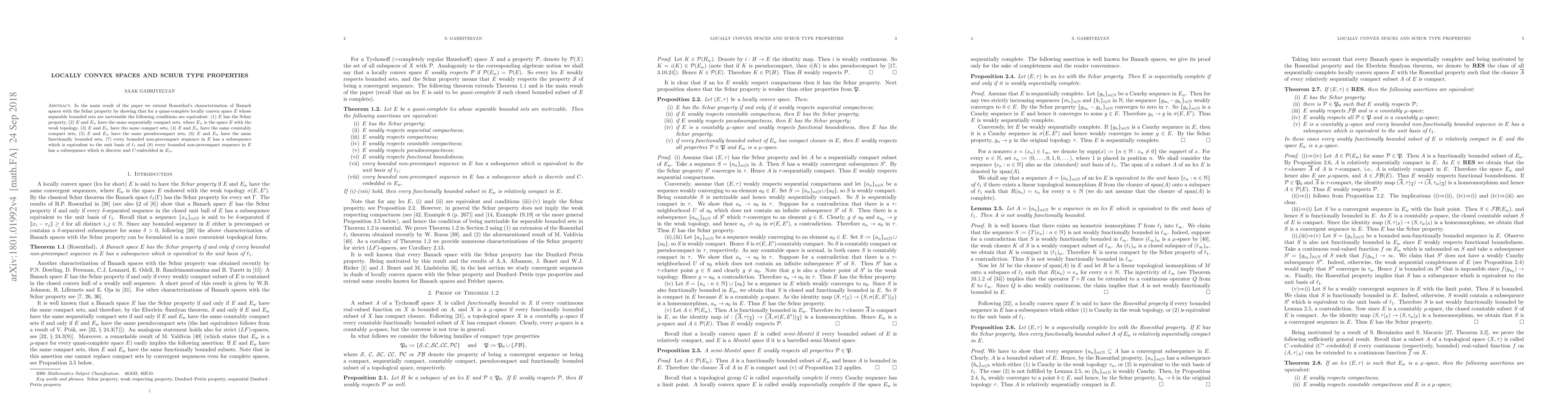 In the main result of the paper we extend Rosenthal's characterization of Banach spaces with the Schur property by showing that for a quasi-complete locally convex space $E$ whose separable bounded sets are metrizable the following conditions are equivalent: (1) $E$ has the Schur property, (2) $E$ and $E_w$ have the same sequentially compact sets, where $E_w$ is the space $E$ with the weak topology, (3) $E$ and $E_w$ have the same compact sets, (4) $E$ and $E_w$ have the same countably compact sets, (5) $E$ and $E_w$ have the same pseudocompact sets, (6) $E$ and $E_w$ have the same functionally bounded sets, (7) every bounded non-precompact sequence in $E$ has a subsequence which is equivalent to the unit basis of $\ell_1$ and (8) every bounded non-precompact sequence in $E$ has a subsequence which is discrete and $C$-embedded in $E_w$.