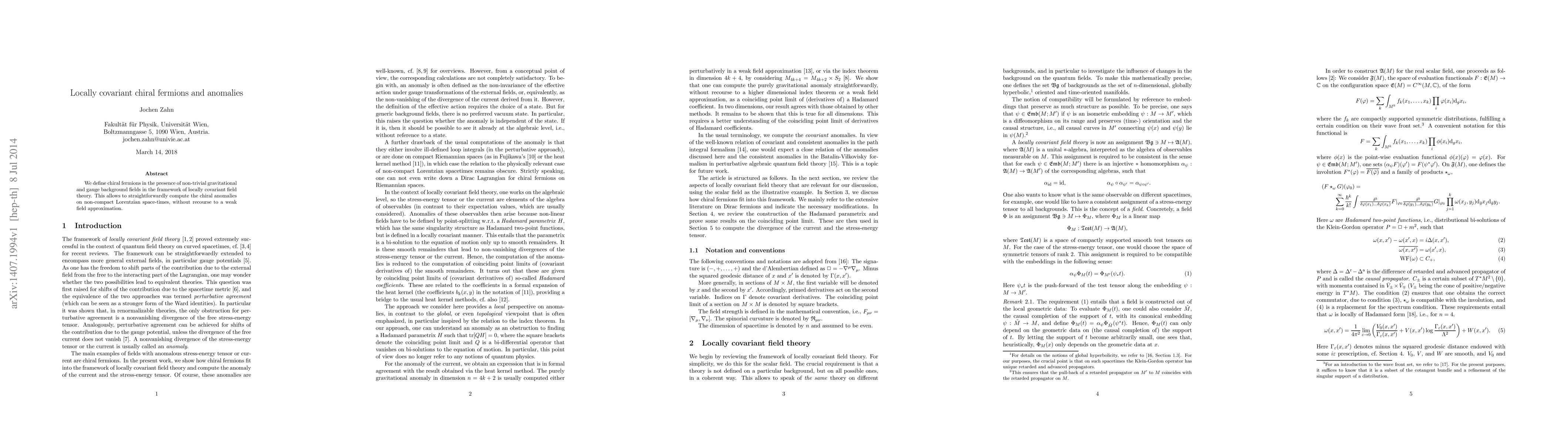 This paper defines chiral fermions in locally covariant field theory under non-trivial gravitational and gauge backgrounds, enabling direct computation of chiral anomalies on non-compact Lorentzian space-times without weak field assumptions.