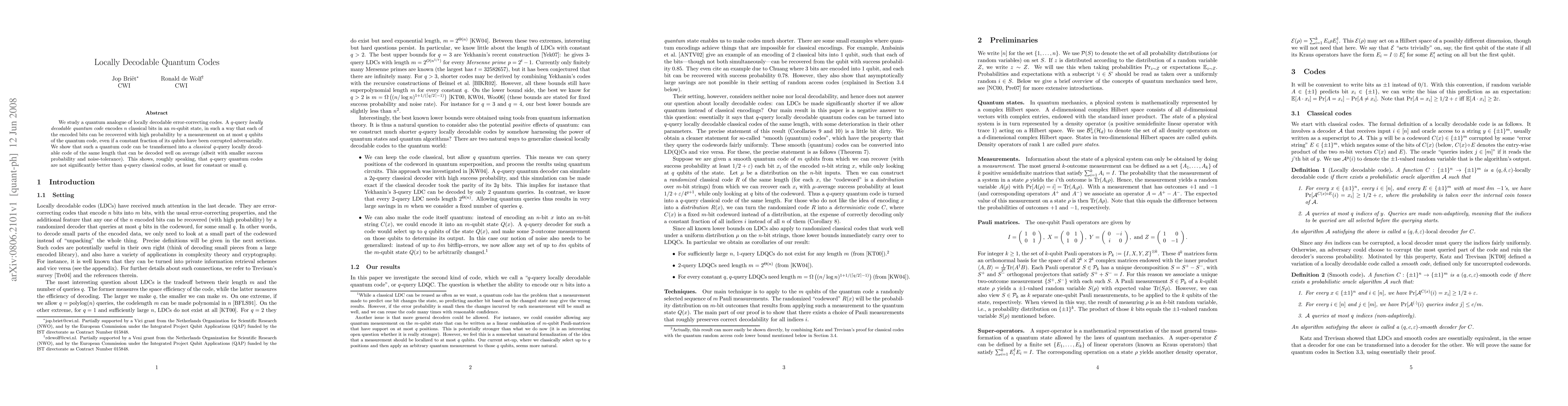 This paper explores quantum analogues of locally decodable error-correcting codes, demonstrating that q-query quantum codes can be converted into classical codes with similar decoding properties. It concludes that quantum codes do not substantially outperform classical codes for small or constant q.